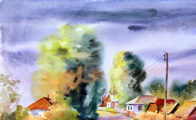 The watercolor painting titled "Morning" depicts a serene rural village at the break of day. The scene is suffused with a soft, diffused light, casting a gentle warmth across the landscape. A central dirt road, painted in shades of dusty lilac and earthy browns, draws the eye into the heart of the scene, suggesting the viewer's journey through this quiet hamlet. On either side of the road, humble cottages with russet and terracotta roofs nestle comfortably within the embrace of nature. The subtle play of light and shadow on their walls indicates the sun's early rays filtering through an overcast sky, which is rendered in muted tones of blue and grey. Verdant greenery in various hues flanks the path and the homes, with trees and bushes depicted in a blend of loose, fluid brushstrokes. These suggest the movement of foliage in a gentle morning breeze, as well as the lushness of the countryside. Above the scene, power lines stretch from a simple wooden pole, reminding the viewer of the connection between the rural and the modern. These lines create a sense of perspective and depth, further emphasizing the expanse of the space. "Morning" encapsulates the quietude and freshness of the countryside at dawn. It conveys a sense of peaceful, daily life waking to the new day, with all elements—the road, the houses, the trees, and the sky—coming together to create a harmonious and inviting rural landscape. The painting evokes a feeling of tranquility and a connection to the simpler aspects of life. 974
