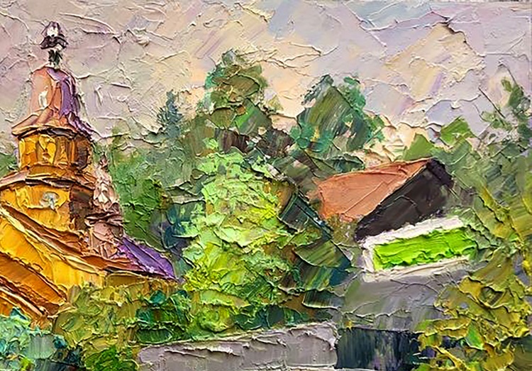 This oil painting titled "Church of the Annunciation of the Holy Mother of God" captures the serene beauty of a religious edifice ensconced in the embrace of nature. The artwork is executed with palpable energy, utilizing the impasto technique where thick, textured strokes of oil paint are layered on the canvas to create a vivid, three-dimensional effect. The church itself, perhaps the titular Annunciation of the Holy Mother of God, rises majestically in the center of the composition. It is rendered in warm, golden hues that draw the eye to its ornate architecture, featuring a prominent dome topped with a cross, symbolizing the sacred within. The gold and brown tones of the structure suggest a richness and history, the patina of age and the glow of the divine. Surrounding the church is a lush tableau of greenery, depicted in varying shades of green and yellow, conveying a sense of vibrant, living foliage. These heavy brushstrokes give the leaves and trees a dynamic texture, as if they are rustling in a gentle breeze. This thick vegetation not only frames the building but also conveys the sense of a church that is both protected and veiled by the natural world around it. Above, the sky is a mélange of whites and blues, with hints of yellow, suggesting a time of day where the sun plays hide and seek with the clouds, casting dynamic light and shadow across the scene. This interaction of light seems to divine a sense of quietude and reverence appropriate to the setting. In the foreground, the earthy tones of the ground are painted with energetic strokes of yellows and greens, suggesting a well-trodden path or a lush carpet of grass leading up to the church, inviting the viewer to enter the scene, to perhaps seek solace or to reflect within the sanctified walls. This artwork masterfully balances the man-made with the natural, the solidity of the church contrasting with the organic forms that envelop it. It evokes a spiritual narrative, suggesting that this place of worship is not merely a structure but a part of the larger creation, seamlessly integrated into the tranquility of its surroundings. It's a visual hymn to the beauty of sacred spaces and their harmony with nature. 993