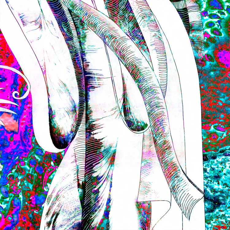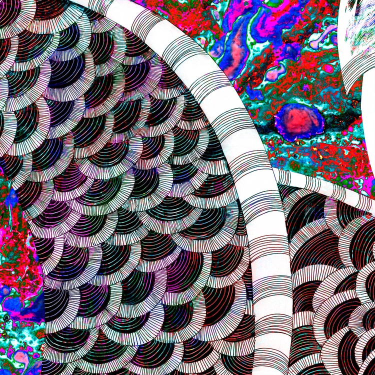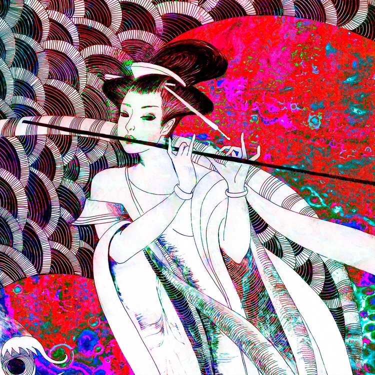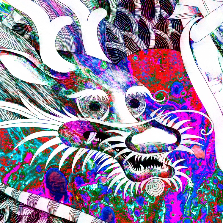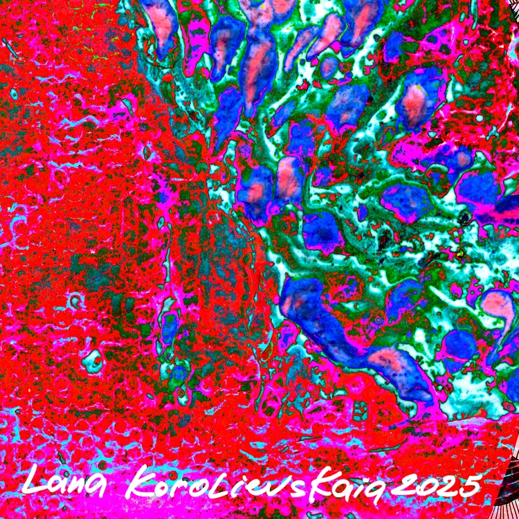 This collage combines the ink graphics "Girl and dragon" (2024) and the oil abstraction "Amaranth flashes" (2019). The black and white outline of the first artwork, personifying logic, coexists perfectly with the multi-colored spontaneity of the second one - just like in the yin-yang philosophy, which is so beloved in Eastern countries. Taken separately, "Amaranth flashes" resemble those strange multi-colored spots that we see in photographs from offices measuring a person's aura. In science, the phenomenon on which this process is based is called the "Kirlian Effect". A specialist could conduct a professional diagnostics of the state of the biofield of a person who has undergone scanning. But even without understanding the intricacies of the correspondence of specific colors to definite chakras, one can confidently say about the high degree of emotional stress of the subject. Which is confirmed by the responsibility that lies with the girl playing the flute, taken from the "Girl and dragon". She expressed the need to appease aggressive forces so that they do not destroy a person. It is impossible to defeat them, but it is quite possible to lull their vigilance. Therefore, the girl plays a charming melody on her flute, which makes the dragon swoon.