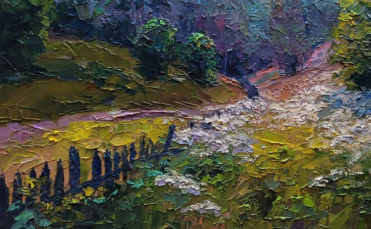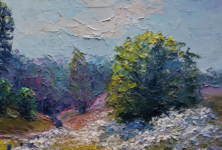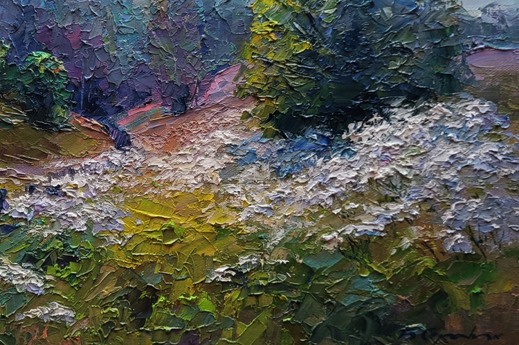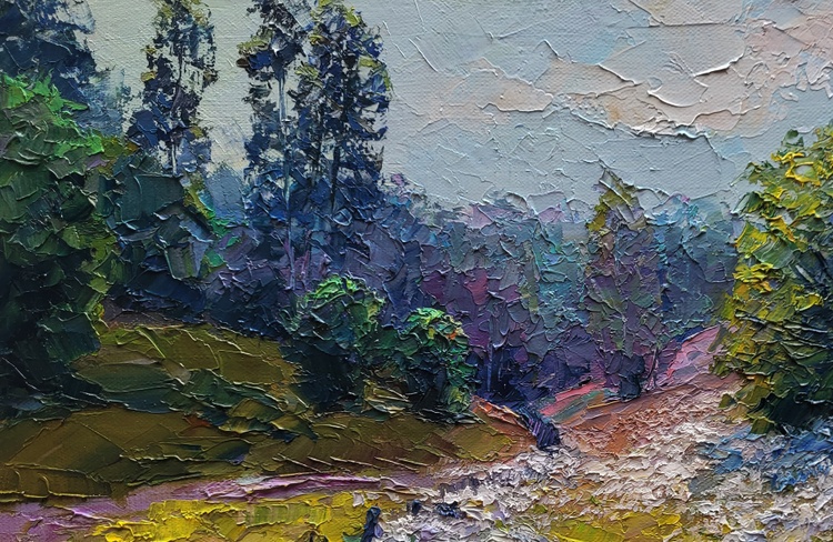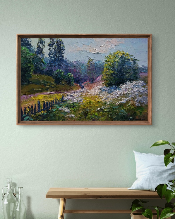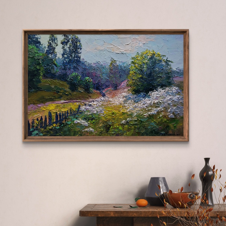 The oil painting on canvas titled "Wildflowers are Growing" captures the gentle harmony of a summer meadow in full bloom, where the natural world unfolds in peaceful abundance. Through thick, textured strokes and a lush palette of earthy greens, soft purples, and creamy whites, the artist constructs a landscape that feels alive with color, scent, and sound. It is a portrait of serenity and natural splendor, evoking a quiet moment in the countryside where time slows and the senses awaken. In the foreground, a vibrant carpet of wildflowers stretches across the field like lace over the land. The flowers are rendered with delicate impasto technique—each bloom standing out in raised dabs of white, blue, and lavender, suggesting motion in the breeze and richness in the variety. These wildflowers seem untouched and unpicked, growing freely along the path and climbing into the grass, symbolizing the spontaneous and untamed beauty of nature. The path curves gently from the left, lined by a rustic fence that leans unevenly into the field. Its dark, weathered planks contrast against the vibrant yellow and green grasses that surround it, offering a touch of human presence within the wilderness. The fence serves as a guide through the composition, leading the viewer’s eye deeper into the landscape and suggesting the whisper of a story—a well-trodden route through fields known to locals, maybe a shortcut home or a favored walk at dusk. To the right, a large bushy tree with a golden-green crown dominates the composition, its leaves catching the light and shimmering with touches of lemon yellow and olive. Behind it, the dense forest recedes into a cool blur of blues and purples, creating depth and contrast. The transition from warm, sunlit flora to the cooler, shadowed woods gives the painting a sense of movement and life, a layered structure that invites the viewer to linger and explore. In the distance, tall trees rise into a pale, overcast sky. Their shapes are softly obscured by mist or perhaps morning haze, blending into the soft mauves and lavenders of the background. This atmospheric layering adds a dreamlike quality to the work, hinting at a time of day when the light is gentle—perhaps early morning or just after a light summer rain. The sky above is a delicate mix of muted blues and creamy whites, with cloud forms that seem to drift quietly, enhancing the painting’s sense of calm. 1173