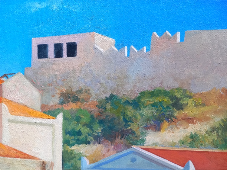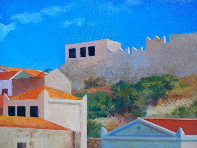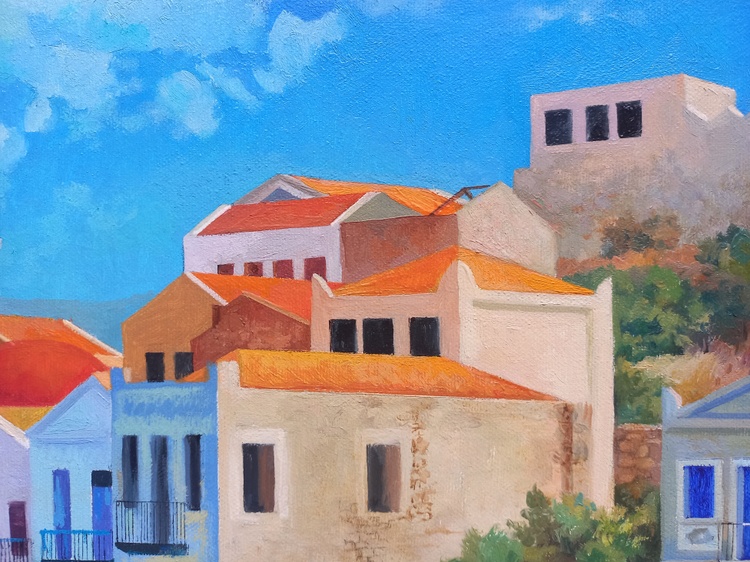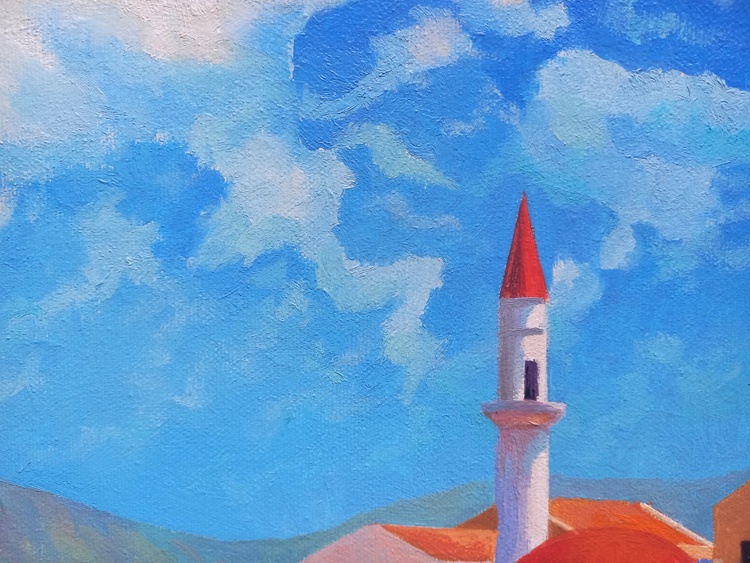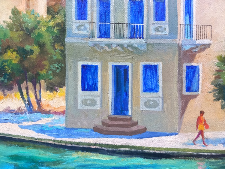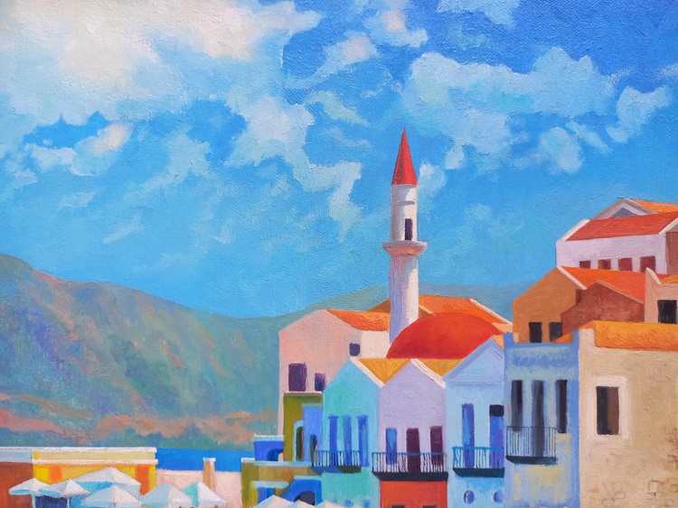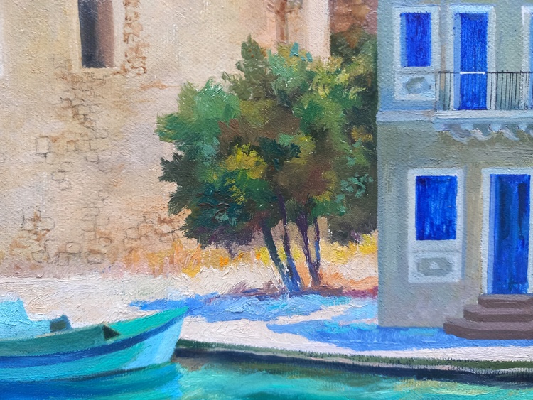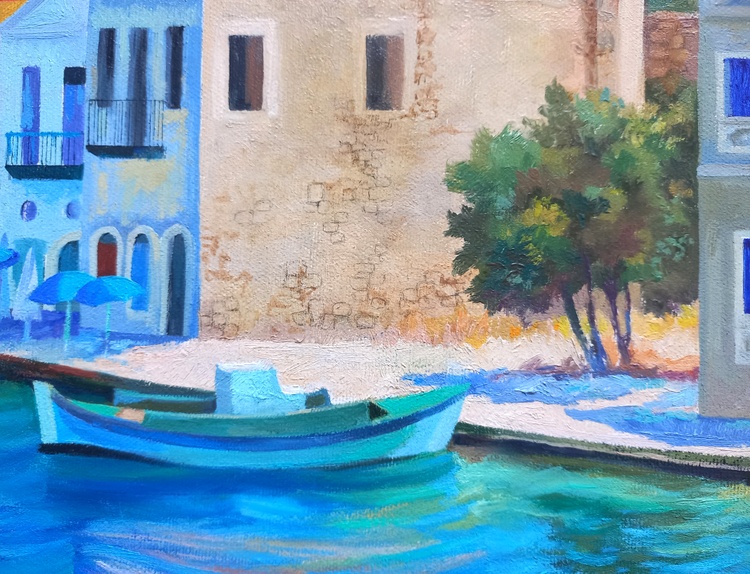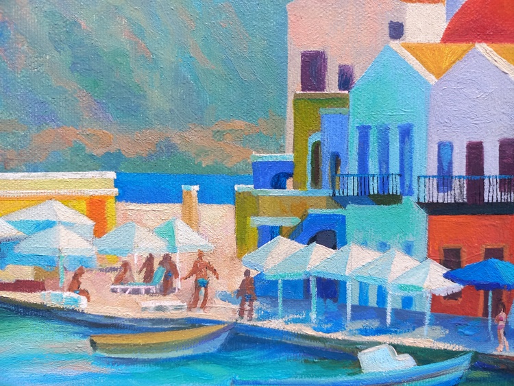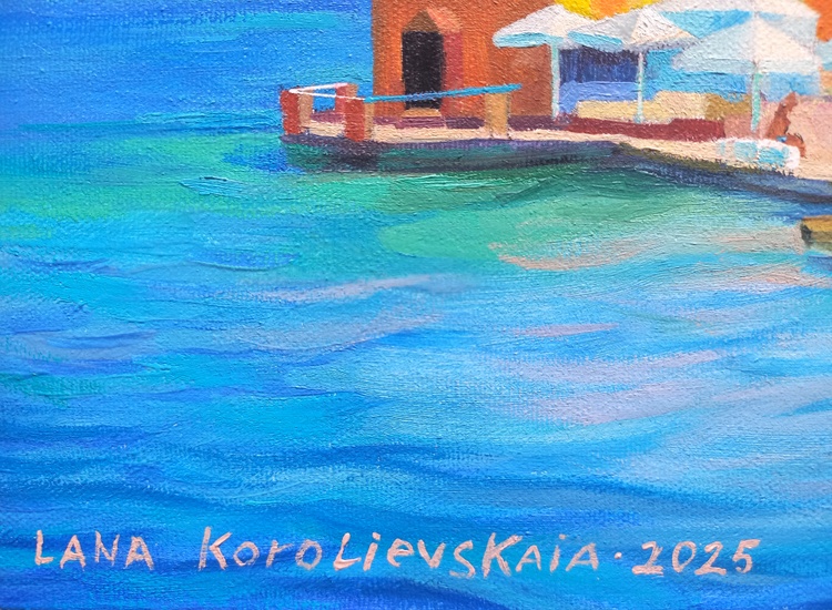At midday, the sky, sea, boats, promenade, light umbrellas, and house facades all melt into one. This is a corner of absolute calm, where time flows slowly and silence is filled with sunlight and breeze. The roofs in red ochre, the multicolored walls form a festive, open palette, while human figures are nearly dissolved into color — like shadows of memories from a summer that never ends. The painting invites you into a world where the sea calls for the refined joy of rest.