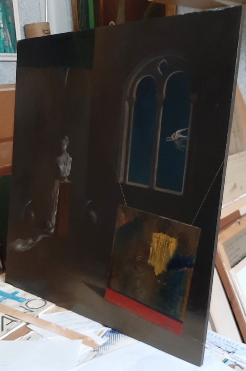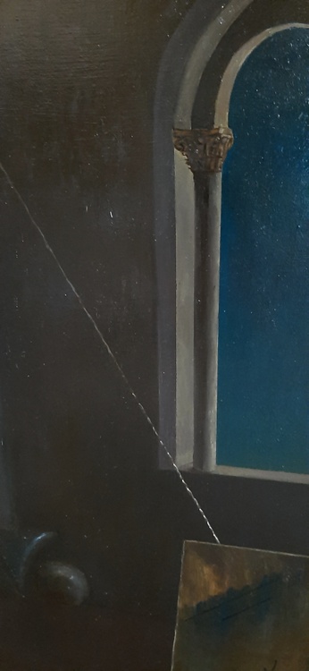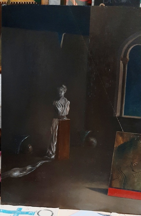 A work created during the Surreal-Metaphysical period, The work presents a dark, almost dreamlike setting, where shadows dominate the space. A classical bust on a pedestal and a Gothic window create an atmosphere of mystery and introspection. The presence of a painting within the painting adds a level of complexity and reflection on art. The lighting is soft, with contrasts between the illuminated and shadowed areas, emphasizing the duality of light and darkness. The scene seems suspended in time, a place of solitary and silent contemplation. Architectural and symbolic elements suggest a connection with the past and an exploration of interiority. The use of dark, deep colors contributes to a sense of depth and mystery, inviting the viewer to immerse themselves in an enigmatic visual narrative.