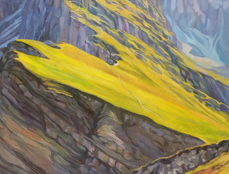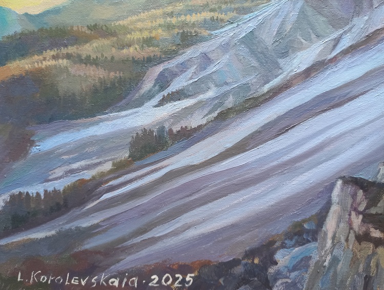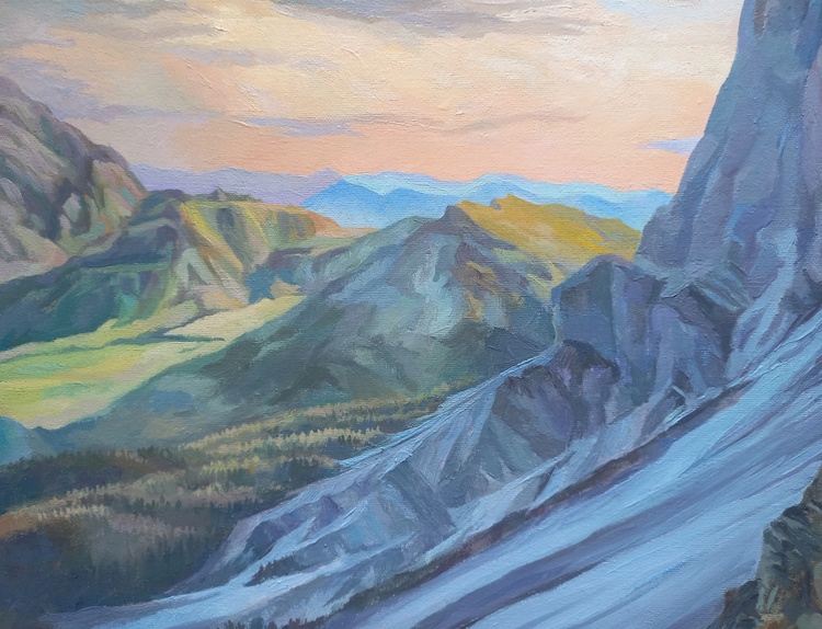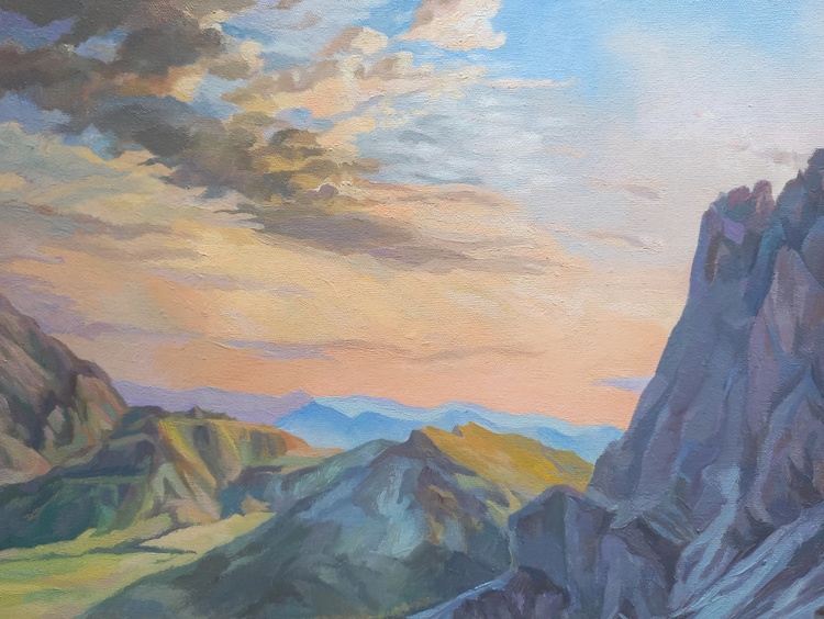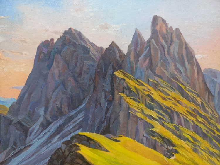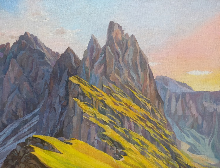 The canvas conveys the grandeur of the Seceda peak in the Dolomites at the first hours of morning. The light of dawn paints the sky in soft rose-golden hues, emphasizing the sharp contours of the rocks and the freshness of the green slopes. The composition unites the solidity of stone and the transparency of air, the silence of the mountains and the movement of light. This encounter of day and eternity turns the landscape into a symbol of balance and the power of nature, where the viewer senses both tranquility and ascension.