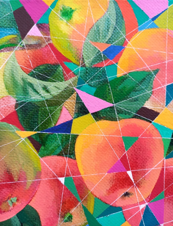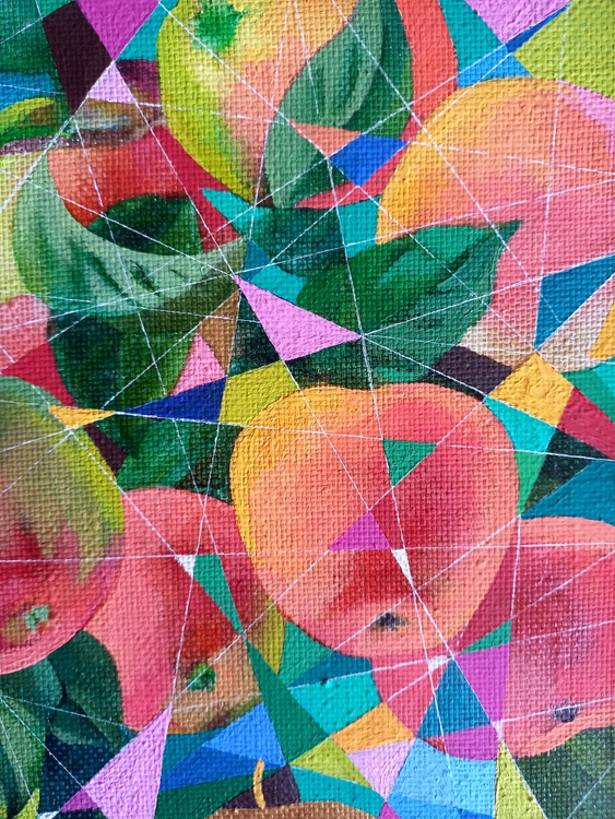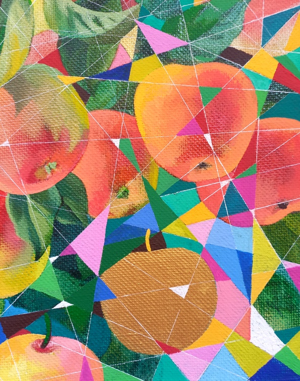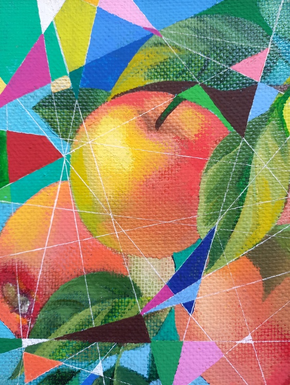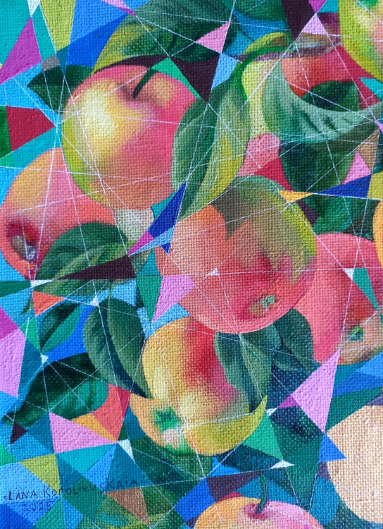 This small work is a continuation of the creative approach that I started in the painting "Dance of butterflies around a flower" (2020), combining a realistic image of flora and abstract geometric structures that dot everything like a web and turn real objects of objective reality into a kind of stained glass or mosaic. A similar principle was implemented by me in the paintings "Diffusion of rose scent" (2020) and "Metaphysical still life of passing autumn" (2024). Suddenly returning to the established approach after the landscapes, I am supplementing my series with this new artwork created on the basis of the developed patterns. And again, as in most of my works, despite the apparent superficiality under the mask of purely visual appeal, one may not notice the fullness of hidden meaning. The contradictory symbol of the apple is shown here in an absolutely benevolent key, without a hint of the consequences of eating it. Once someone has tasted the forbidden fruit, he can't stop yet. Advertising media provide the most sophisticated consumers with a wide range of fruits for every taste. And these fruits are no longer forbidden. They exude a scent, attracting those connoisseurs of their taste who will appreciate them, just as flowers attract insects, and ladies attract gentlemen, sprayed with pheromone deodorant. The unlined nature of the picture plane makes it resemble a mosaic, created from separate fragments of the primary building material, linked together by someone's creative genius, who managed to unite the disparate into an indivisible whole, which, however, is only one of the possible combinations.