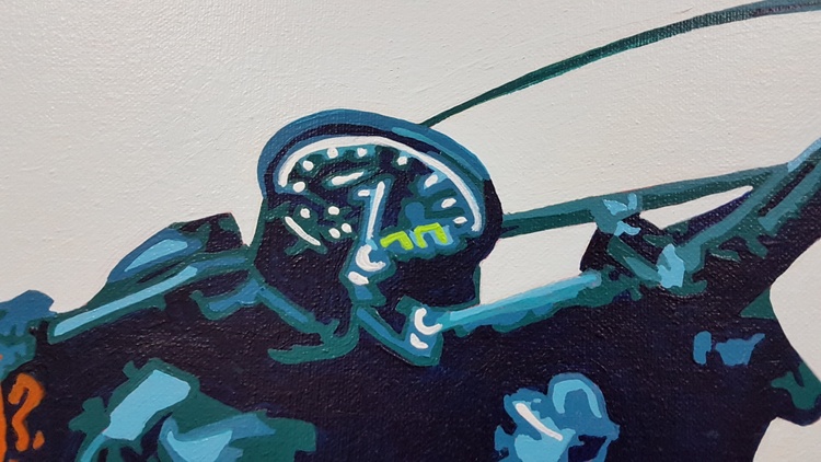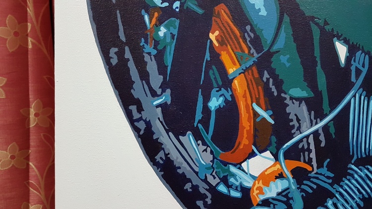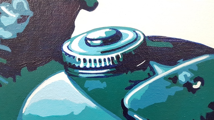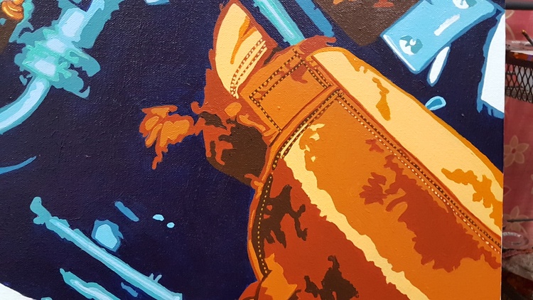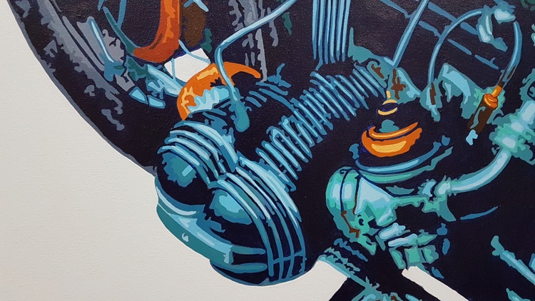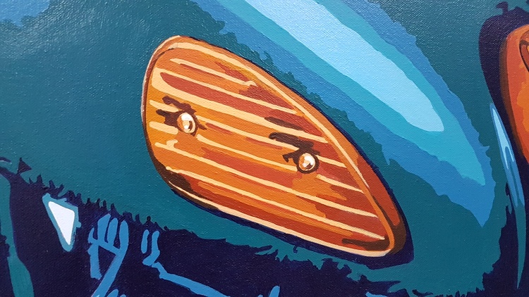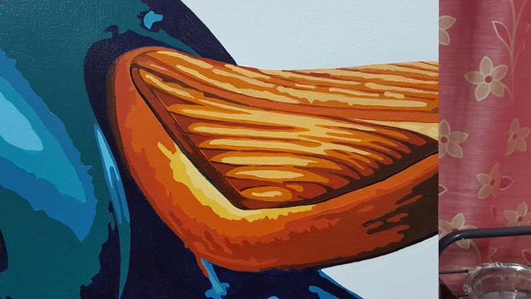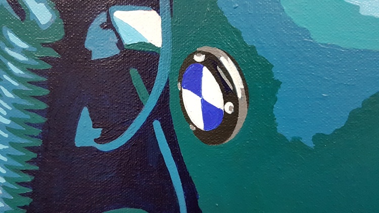 This is an original contemporary POP Art painting of a square shape. It is an acrylic on canvas artwork with the Classic Vintage BMW Motorbike in the center, and occupying the majority of the canvas. The entire automobile is covered in bright, and vibrant colors of blue-green, orange and more, making the painting well-balanced and very attractive. This artwork is from my series “Automobiles – Classic meets POP” About my Series: Automobiles – Classic meets Pop! I draw my muse from what Andy Warhol once said, “All things are beautiful, but not everyone knows how to recognize them.” It is this concept of finding beauty in unexpected places that has driven my passion for the Automobiles Series. Inspired by the influential characteristics of Pop Art, I have combined the most beautiful and majestic Classic Cars and Bikes with bright and vibrant colors to turn them into my own unique pieces of Pop Art. The beauty of Classic Automobiles is evergreen. These timeless machines have captivated the hearts of enthusiasts for decades. Each vehicle possesses its own aura of elegance and uniqueness that sets it apart from the rest. From the smooth curves of a vintage Cadillac to the sleek lines of a classic Harley-Davidson, every Classic Car and Bike exudes a sense of sophistication that lingers in the air. What truly sets Classic Automobiles apart is the incredible creativity and uniqueness embodied in each model. The designers and engineers of these legendary vehicles embraced innovation and artistic expression, pushing the boundaries of what was possible in the automotive world. Each make and model tells its own story, reflecting the era in which it was created and the vision of its creators. As an artist, I have found endless inspiration in the aesthetics of Classic Automobiles. The intricacies of their design, the attention to detail, and the sheer craftsmanship involved have moved me deeply. I see these vehicles not just as modes of transportation but as pieces of art in their own right. Through my paintings, I aim to capture the essence of their beauty and transfer it onto the canvas, preserving their enchanting allure for generations to come. The influence of Pop Art on my Automobiles Series cannot be overstated. Pop Art, with its goal of blurring the lines between high and low culture, has provided me with a framework to celebrate the beauty of these vehicles in a unique and engaging way. By combining the imagery of Classic Cars and Bikes with vibrant and bold colors, I aim to create a visual experience that is both visually striking and emotionally captivating. One of the most revolutionary aspects of Pop Art is the rejection of a hierarchy of culture. In the realm of art, traditionally, some subjects were considered more worthy of artistic representation than others. However, Pop Art challenges this notion, suggesting that inspiration and beauty can be found in everyday objects just as much as in traditional artistic subjects. The Classic Cars and Bikes that I choose to showcase in my Automobiles Series are a testament to this approach, as they embody the fusion of functionality and design. The vibrancy and energy of Pop Art are reflected in the colors I select for my Automobiles Series. Bright, bold, and eye-catching, the colors I use breathe new life into the classic forms of the vehicles. Each color choice is deliberate, aimed at evoking certain emotions and creating a visual impact showing that beauty can be found in unexpected places.