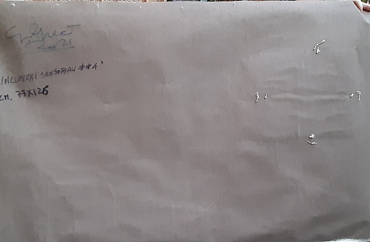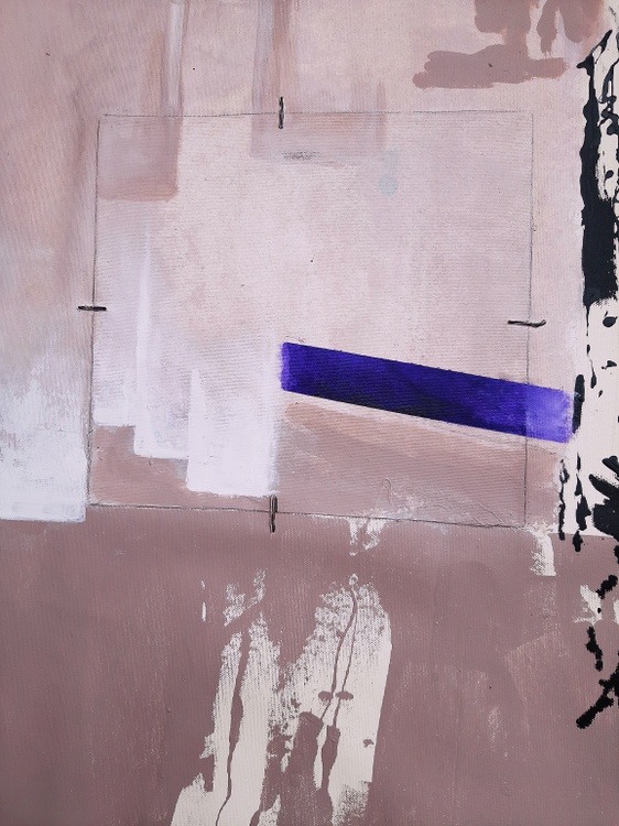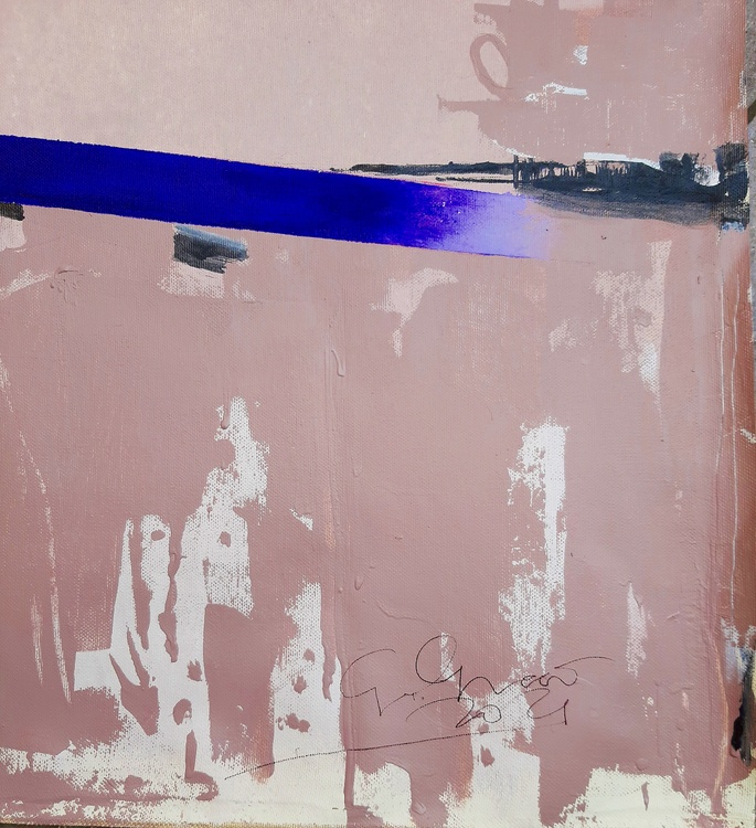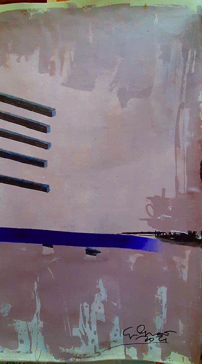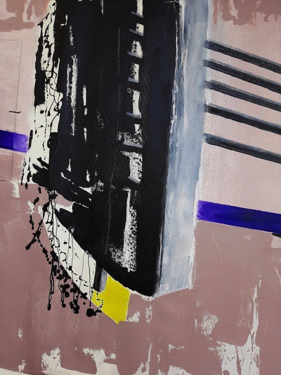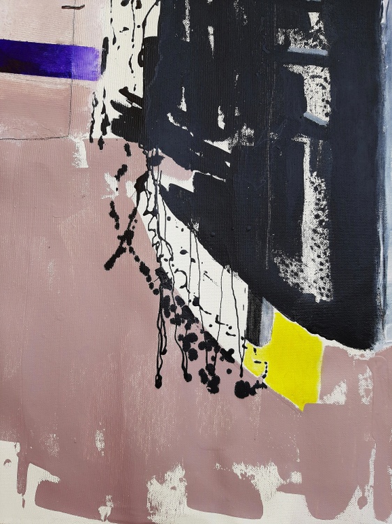 The abstract work featured here uses a bold and contrasting color scheme, with a predominantly pink background featuring black, purple, and yellow elements. The composition is characterized by geometric shapes and lines that create a sense of movement and dynamism. The use of black and dark blue creates a strong contrast against the delicate pink background, while the small touch of yellow adds an intriguing focal point. The surface texture appears variegated, with brushstrokes suggesting layered depth and complexity. The vertical and horizontal elements suggest a sense of abstract architecture, and the overall composition strikes a balance between chaos and order typical of abstract art. The work could reflect an exploration of themes of modernity and structure in contemporary space. It could also represent an expression of emotion through the use of abstract shapes and colors. The complexity and depth of the work offer many interpretative possibilities, making it a fascinating piece to explore visually. CM. 77 x 126