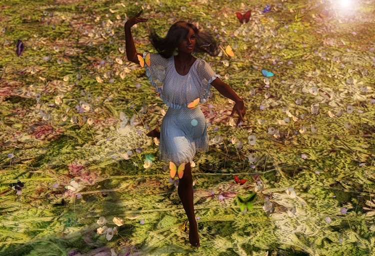 This is a digital CGI artwork depicting a joyful, dark-skinned woman dancing in a sunlit, lush meadow. The woman is centrally positioned, mid-jump, with her arms gracefully raised and her long, wavy black hair flowing in the breeze. She is wearing a light blue, short-sleeved, knee-length dress with a subtle white pattern. The dress has a slightly loose, airy texture, which adds to the sense of movement and freedom. The meadow is abundant with green grass and scattered with small, colorful flowers in hues of yellow, orange, pink, and blue. The sunlight creates a warm, golden glow, casting soft shadows and highlighting the textures of the grass and flowers. Tiny, translucent bubbles float around the woman, adding a whimsical and magical element to the scene. In the background, the meadow stretches out, with more greenery and flowers, and a bright, radiant sunbeam illuminates the top right corner, enhancing the overall warm and cheerful atmosphere. The digital art style is highly detailed and realistic, with a focus on light and texture, creating a vibrant and dynamic composition that captures the essence of joy and freedom. A bunch of muti-color butterflies flying around the woman