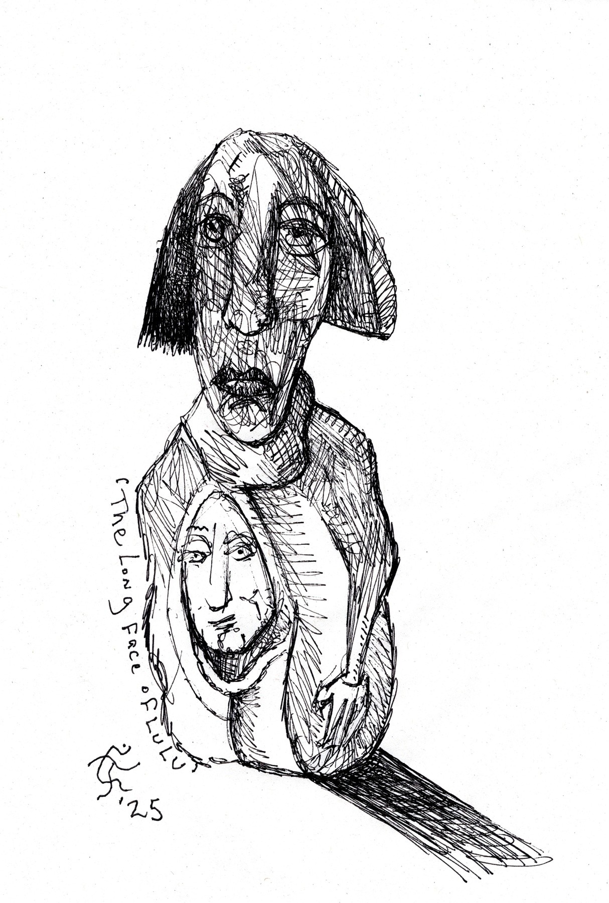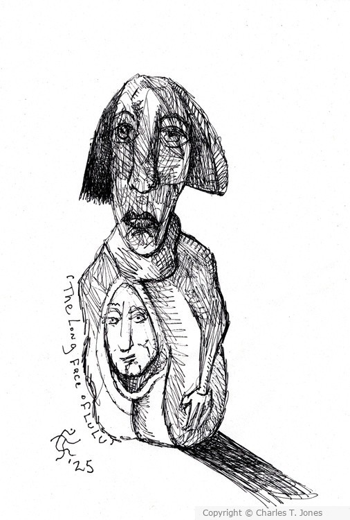 Yesterday I pulled out a scribble pad of what looks to be thin newsprint and did several quick sketches. A couple of them, I liked a bit. This is a gel pen drawing on scribble pad paper. You could call it a scribble drawing and not be far off. It measures roughly 8.5 by 5 inches. Original Jones Art, still wondering if his scribblings have any intrinsic value here in northwest Austin, Texas.