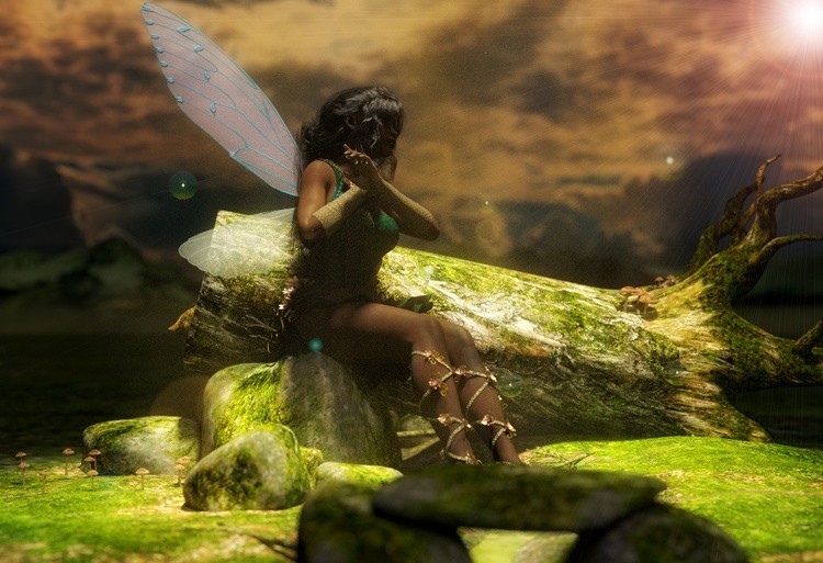 This is a highly detailed CGI (computer-generated imagery) fantasy artwork depicting a dark-skinned fairy woman with translucent, iridescent wings adorned with small, blue, star-like patterns. She is sitting on a large, moss-covered log in a lush, green forest clearing. Her long, wavy black hair partially obscures her face as she covers it with her hands in a gesture of shyness or contemplation. She is wearing a form-fitting, sleeveless, dark brown dress that accentuates her slender yet curvaceous figure, along with golden, ankle-high sandals that have intricate, ribbon-like straps wrapping around her calves. The fairy's breasts are moderately sized and subtly outlined by the dress. The background features a serene, slightly blurred forest landscape with tall, dark green trees and a soft, orange-tinged sky, suggesting either sunrise or sunset. Light filters through the trees, creating a warm, golden glow that highlights the moss on the log and the fairy's wings. The ground is covered in green moss and scattered with small rocks. The overall mood of the image is mystical and serene, blending natural elements with fantasy elements to create an enchanting scene.