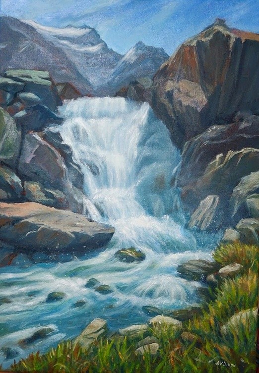 This waterfall is found 1 km above Steingletcher on the Sustenpass in the Bernese Oberland. A studio painting on linen canvas, 50 x 70 cm, painted from on-site oil and pastel sketch studies I made beforehand. The mountain behind is theTierberg .