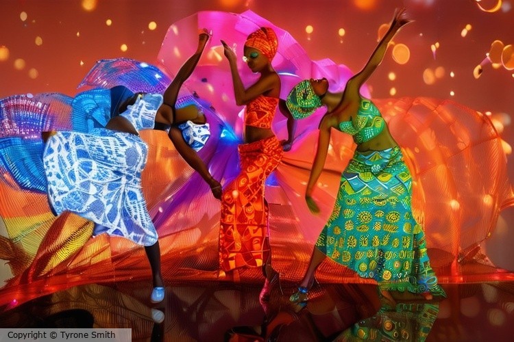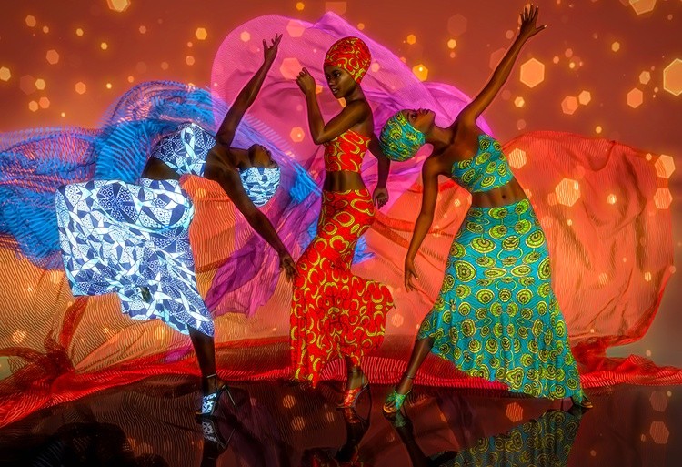 This is a vibrant photograph capturing four African women dancing energetically against a warm, orange-hued background adorned with bokeh lights. Each woman is dressed in a colorful, patterned outfit that includes a headwrap and a matching dress or skirt. From left to right: 1. The first woman wears a blue and white patterned dress with a blue headwrap. Her dress features abstract white patterns on a blue background, and she has black boots. She is mid-step, with one arm raised and the other bent at her side. 2. The second woman is dressed in a bright red outfit with yellow patterns and a red headwrap. Her dress is a long skirt and a cropped top, and she is slightly bent forward with her arms extended outward. 3. The third woman wears a red outfit with yellow patterns, similar to the second woman, but with a more fitted skirt. Her headwrap matches her outfit. She is leaning forward with one arm raised and the other bent. 4. The fourth woman is dressed in a turquoise outfit with yellow patterns and a turquoise headwrap. Her dress is a long skirt, and she is slightly bent forward with one arm raised and the other extended outward. Behind them, sheer fabrics in blue, pink, and red are draped and flow dynamically with the movement, adding to the sense of motion and energy. The floor is reflective, adding depth to the image. The photograph is rich in color and texture, emphasizing the vibrant patterns and dynamic movement of the dancers.
