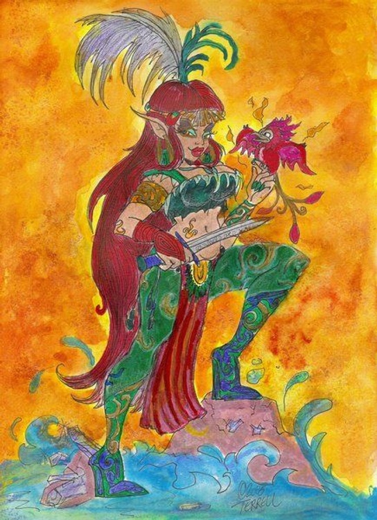 This picture depicts my imagination of what an Atlantean might have looked like. She holds a phoenix on her finger, and it whispers secrets about the future of the city and its people. Based on the smirk on her face, it doesn’t seem like a bad secret! (C) 2005, Terrell Smith-Dorfeo.