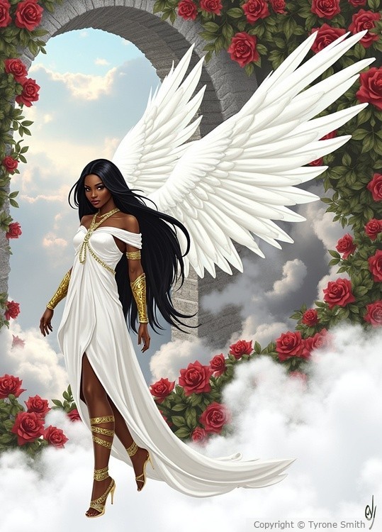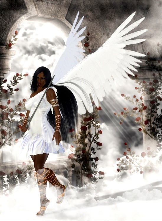 This is a digital artwork depicting a powerful, dark-skinned woman with long, flowing black hair and large, white angelic wings. She stands in a mystical, ethereal garden filled with red roses and surrounded by soft, white clouds. The woman is dressed in a white, off-the-shoulder, flowing dress adorned with golden arm bands and leg wrappings, giving her a warrior-like appearance. Her wings are spread wide, and she gazes forward with a confident, serene expression. The background features an arched stone structure, partially obscured by the clouds, adding a sense of ancient grandeur. Light beams through the clouds, highlighting the woman and creating a heavenly atmosphere. The overall color palette includes whites, dark skin tones, red roses, and gold accents, contributing to the ethereal, divine quality of the image. The texture of the clouds and roses is soft and realistic, contrasting with the smooth, digital rendering of the woman's dress and wings. The composition combines elements of fantasy and realism, creating a captivating and otherworldly scene.