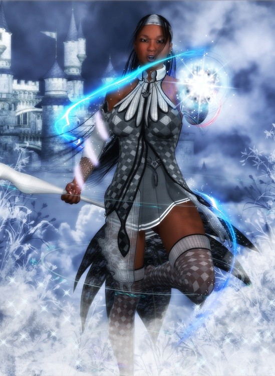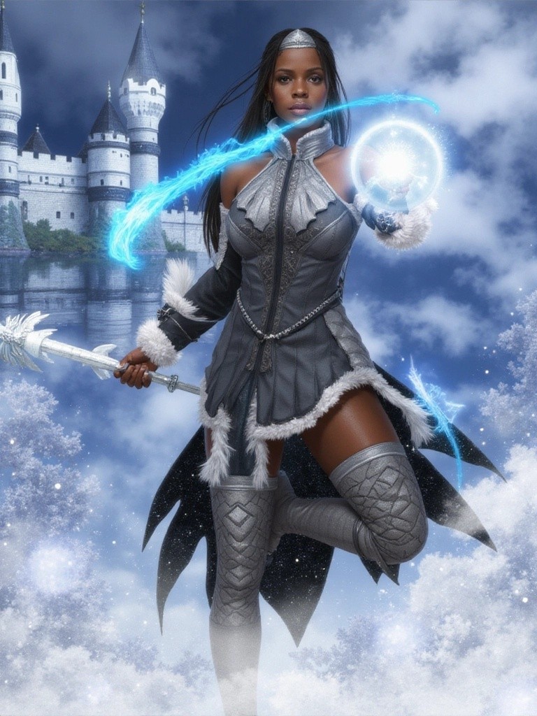This is a digital illustration of a dark-skinned, muscular woman with long black hair, dressed in medieval-inspired armor with a grey and white color scheme. She is wearing a silver headband and a short, armored dress with diamond patterns, thigh-high stockings with a diamond pattern, and knee-high boots. Her outfit is adorned with white feather-like accents on the chest and shoulders. She holds a glowing blue magical staff in her right hand, which emits a bright, radiant light, and a circular magical orb in her left hand. Her expression is determined and focused. The background features a blue and white color palette with a castle in the distance, partially obscured by mist and magical energy. The ground is covered in white, ethereal plants and sparkles, adding a magical atmosphere to the scene. The illustration has a fantasy art style, with a high level of detail and a realistic yet fantastical aesthetic. The overall composition emphasizes the character's strength and magical prowess, set against a mystical, otherworldly backdrop.