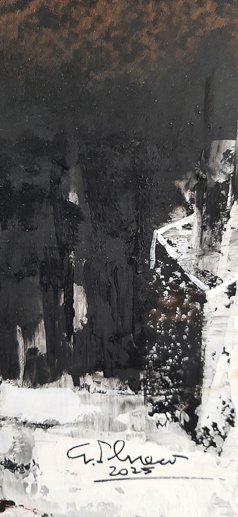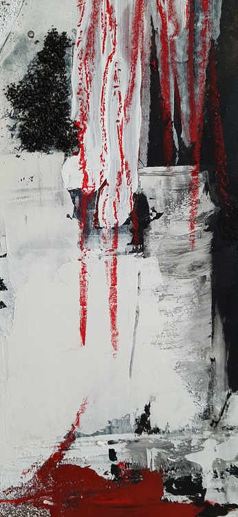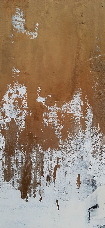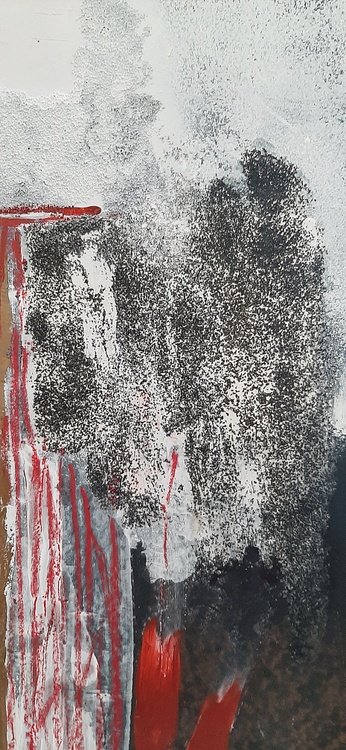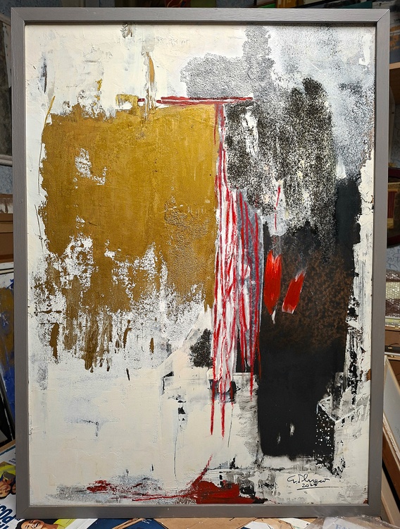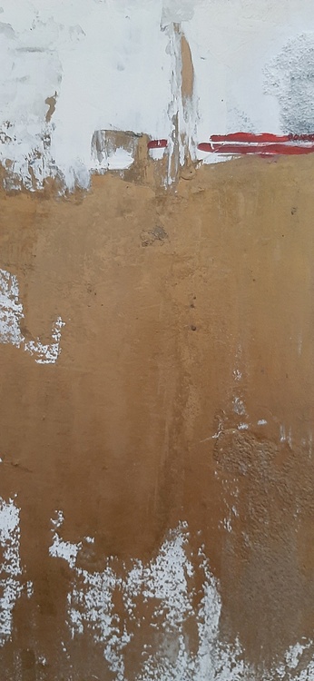 The work clearly falls within the realm of material abstraction, where gesture and layering take on a narrative role stronger than representation. The surface appears as a field of tension: broad areas of dirty white and cool grays interact with a central ochre mass, earthy and almost wall-like, evoking erosion, time, and sedimentation. The composition is asymmetrical but well balanced. The large golden area on the left establishes a stable and 'heavy' presence, while the dark band on the right, interrupted by vertical red drips, introduces instability and drama. The red, used sparingly but decisively, functions as an element of emotional rupture: it suggests a wound, a trace of life, or violent memory, without ever becoming illustrative.