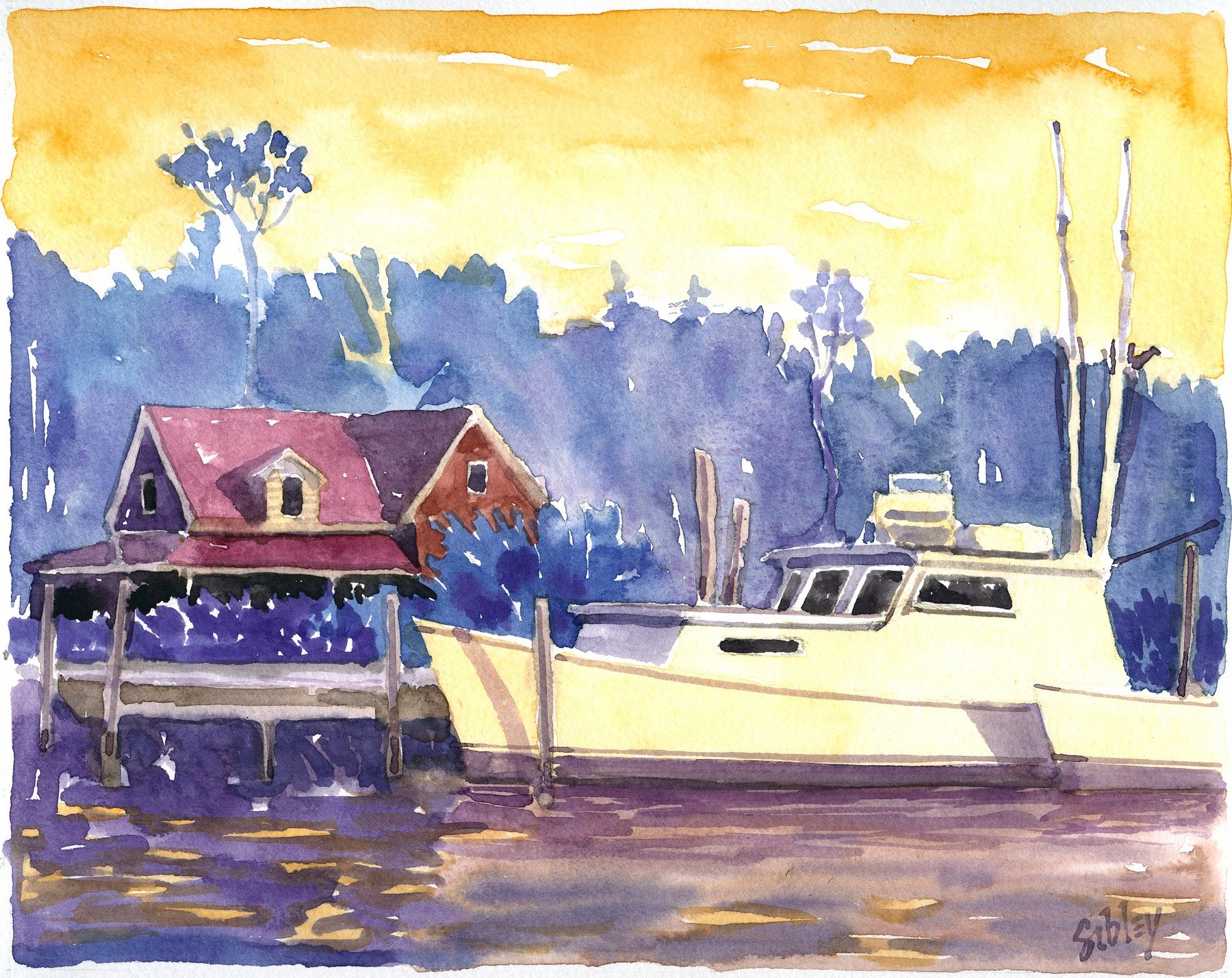 Inspired by a visit to a rural coastline inlet in Florida. It occurred to me that having a trawler in the harbour outside your home is indeed a short commute to work.