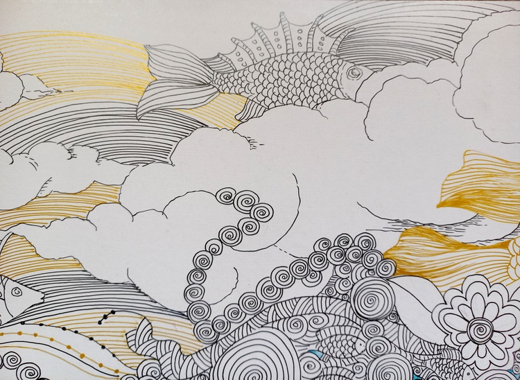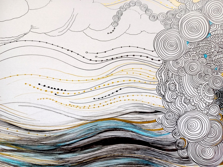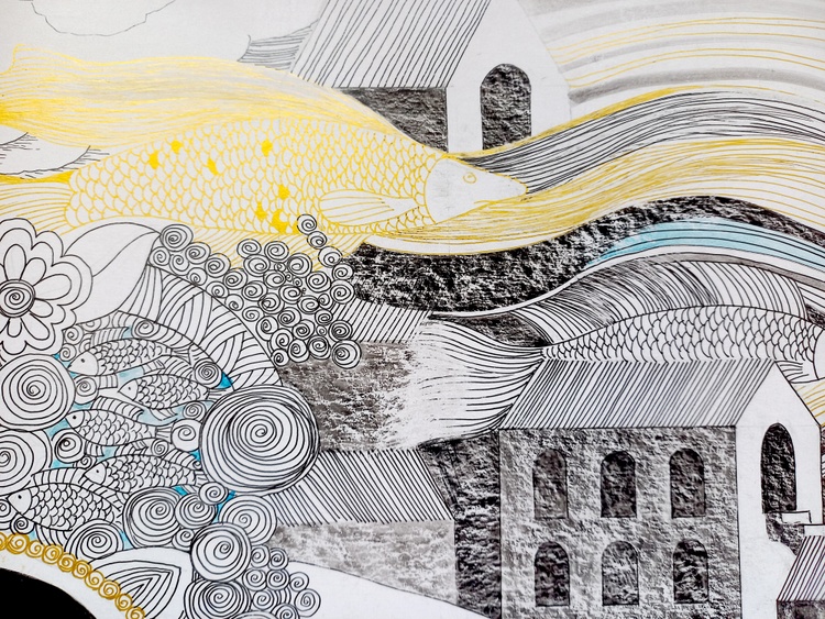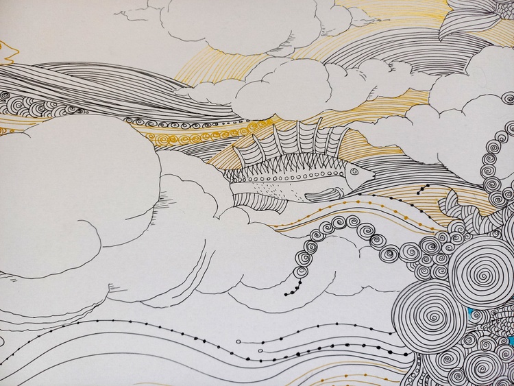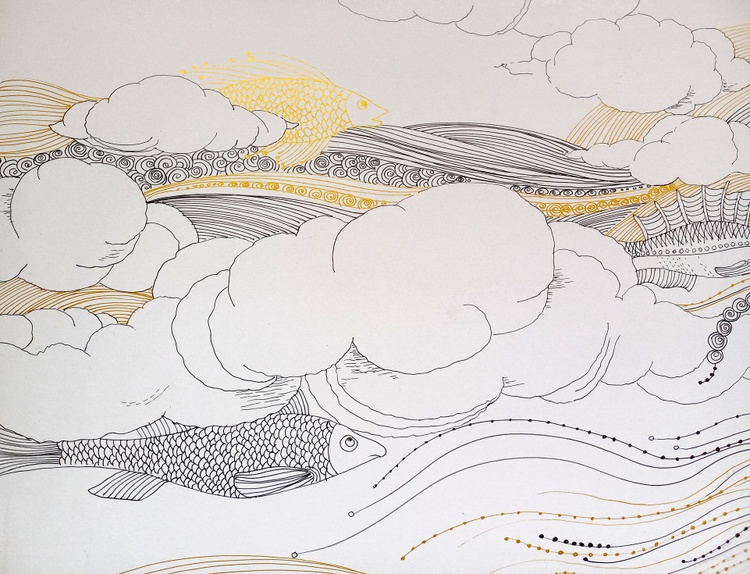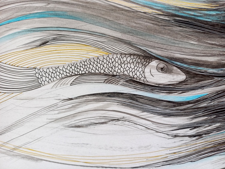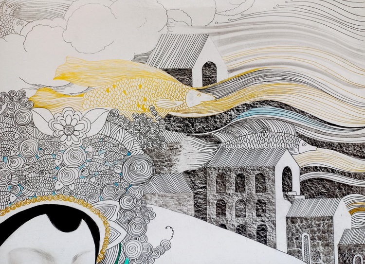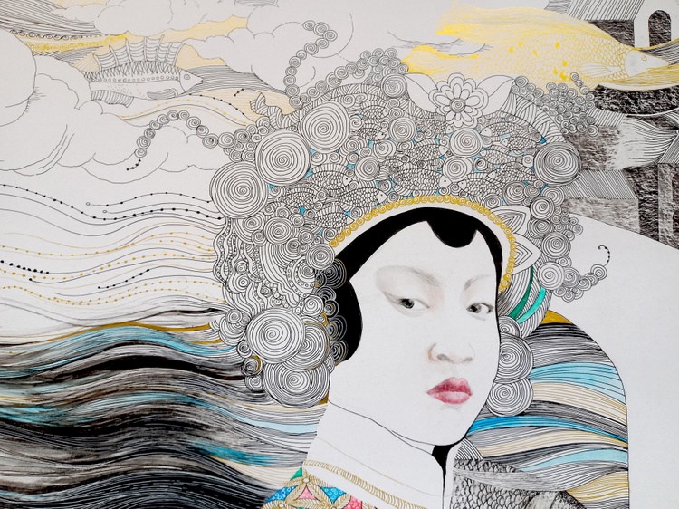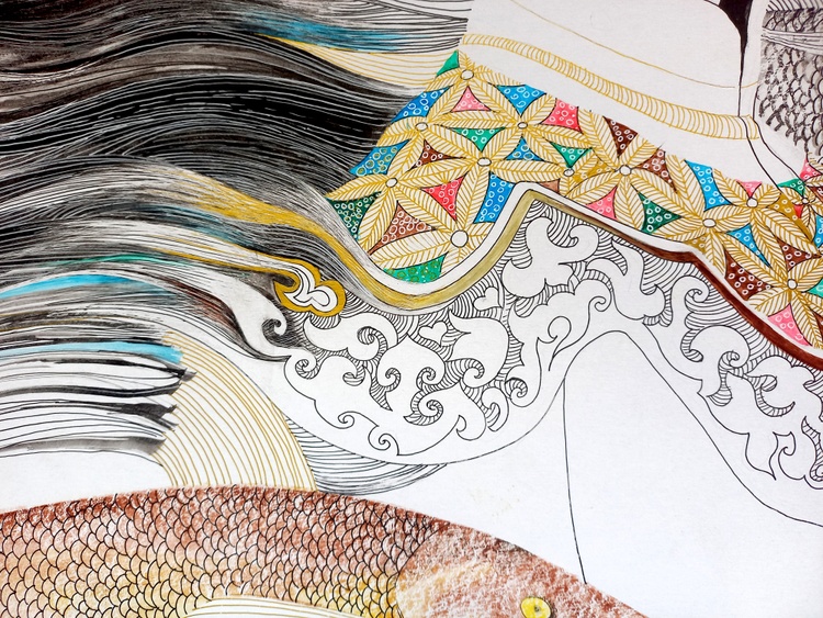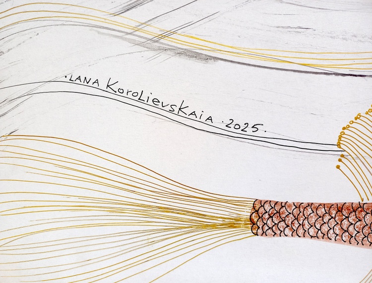 The work depicts a female figure intertwined with a natural element through the rhythm of lines and fluid graphic structures. The headdress of an Eastern beauty is woven from numerous fish. Waves transforming into clouds form a continuous stream in which the fish move — symbols of depth, memory, and inner knowledge. The half figure acts as a mediator between different levels of the world: water, sky, and earth. Her calm, focused gaze holds this multilayered reality in balance. Detailed graphics, delicate linework, and the choice of accent colors — gold, turquoise, and red — create a sense of quiet strength and constant movement. “Keeper of Currents” presents a guardian figure who maintains the connection between past and present, between natural and human realms. The work explores the idea of an inner current as a form of memory and as a state in which the world regains its wholeness.