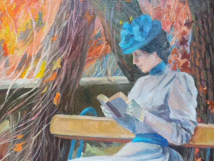The painting captures a brief, precious moment—the last warm days of the golden autumn, when the old garden still holds a soft glow of the fading season. A woman reading on a bench is immersed in her own quiet space, becoming a natural part of the calm, gently fading landscape. The shimmering autumn foliage enhances the sense of silence and the subtle slowing of time. The dog at her feet adds a touch of domestic warmth and trust. It is a scene of solitude where nature and human presence momentarily fall into the same rhythm.