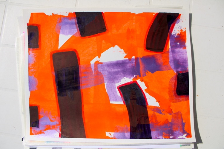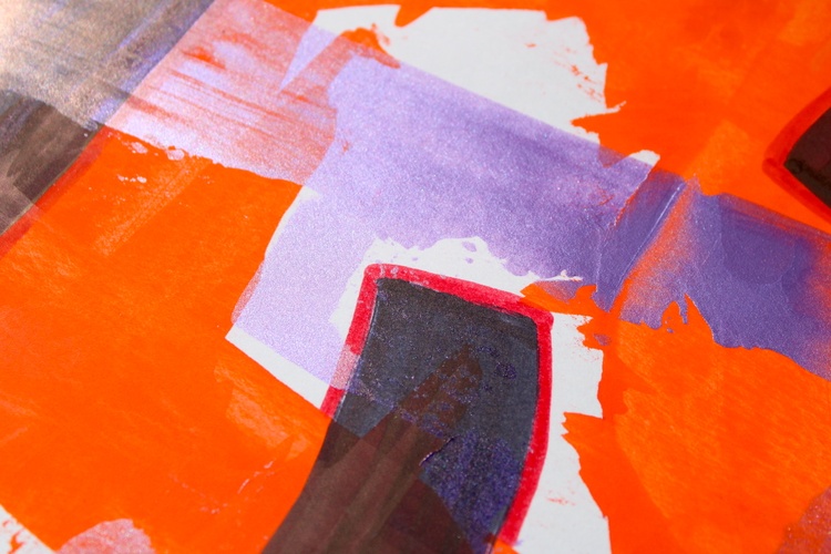 Large fields of intense orange dominate the surface, interrupted by strong black vertical forms outlined with subtle red edges. Soft violet passages and raw white spaces emerge beneath the layers, adding depth, tension, and quiet movement. The composition feels architectural and rhythmic, inviting the viewer to pause and reflect on form, structure, and negative space.