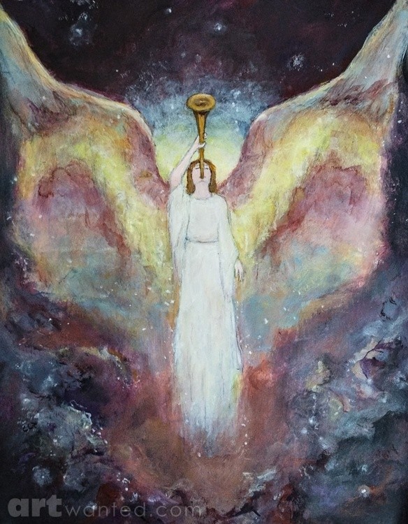 This is the second painting in a series of end times events according to the book of Revelation. In this scene an angel is sounding the first trumpet which brings fire and hail mixed with blood to the people of the earth. An ethereal angel stands amidst a cosmic background holding a trumpet. The angel's wings spread wide, blending into the swirling colors of the galaxy.