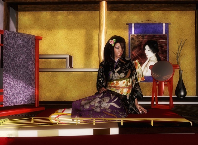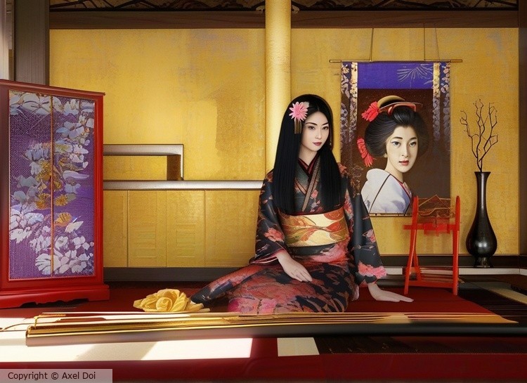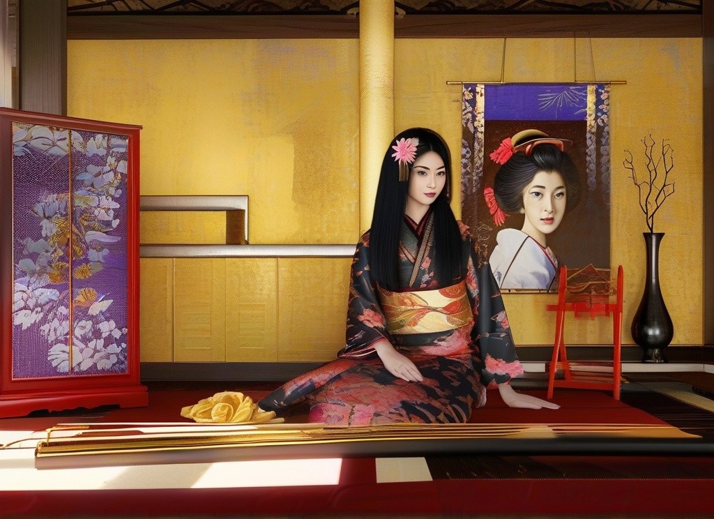 This is a highly detailed photorealistic a Japanese woman seated on a red and gold tatami mat in a traditional room. She has long, straight black hair adorned with a pink and white flower hairpin. Her skin is fair, and she has a slender build. She is wearing a black and purple kimono with intricate floral patterns and a yellow and orange obi (sash) with a floral design. The background features a gold textured wall with a rectangular window displaying a portrait of a traditional Japanese woman with white hair and a red kimono. To the left, there is a red and purple wooden cabinet with a geometric pattern. In the foreground, a golden bamboo flute rests on the tatami mat. To the right, a small red wooden stool with a black vase and a single, thin twig in it stands against the wall. The lighting is warm, casting soft shadows that add depth to the scene. The overall style is realistic with a focus on traditional Japanese aesthetics.