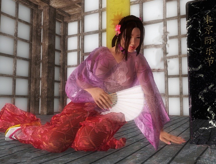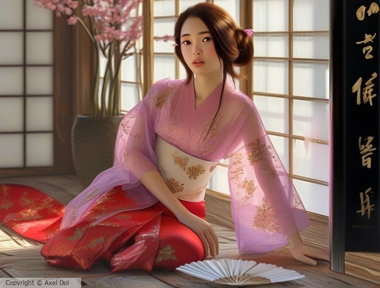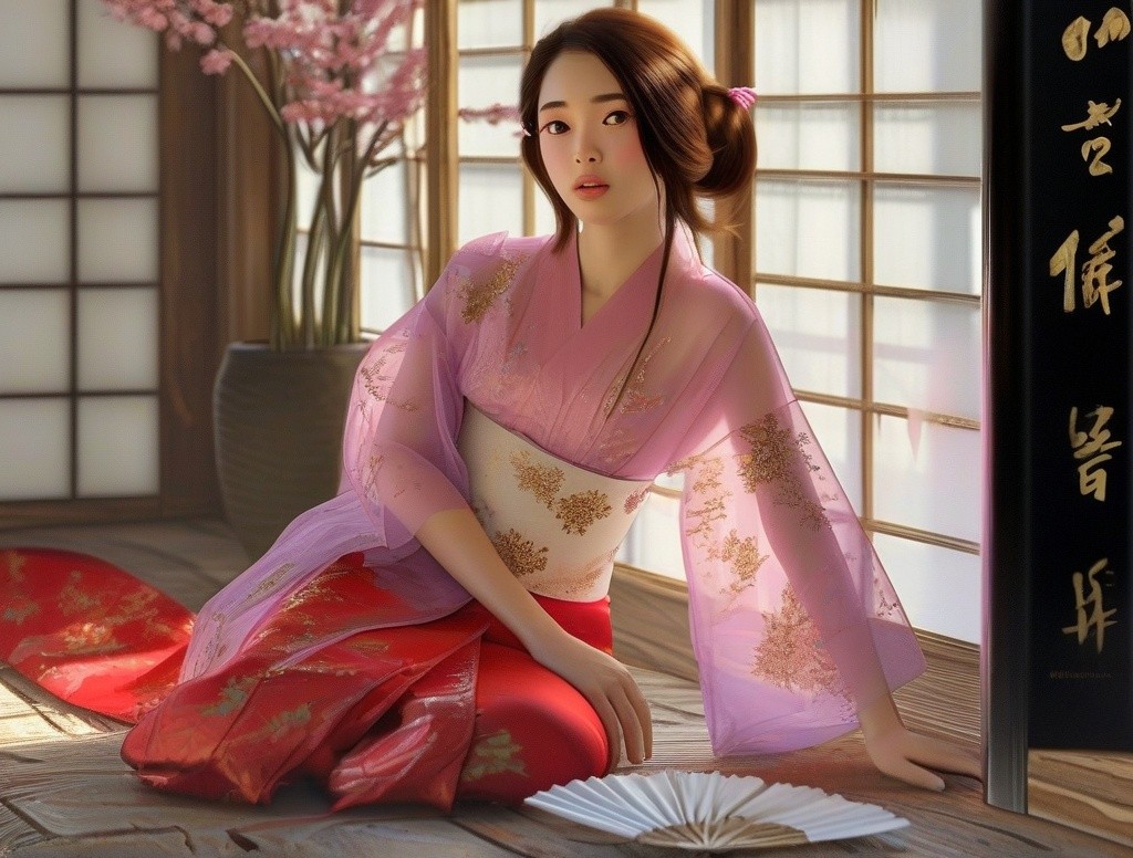 This is a photorealistic image featuring a young Asian woman with fair skin and long, dark brown hair adorned with a pink flower on the right side. She is seated on a wooden floor in a traditional Japanese room with wooden sliding doors and a yellow pillar in the background. The woman is wearing a semi-transparent, purple kimono with intricate floral patterns, and red, crinkled hakama pants. Her kimono is open, revealing a white, pleated undergarment. She holds a white folding fan in her right hand and leans slightly forward with her left hand resting on the floor. Her expression is one of slight surprise or concern, with her lips parted and eyes looking downward. The texture of her kimono is delicate and slightly sheer, contrasting with the more opaque and textured red hakama. To the right of the image, there is a vertical black panel with gold Japanese characters. The room's lighting is soft, highlighting the textures of the wooden floor and the fabric of her clothing. The overall style of the image blends traditional Japanese aesthetics with modern digital art techniques.