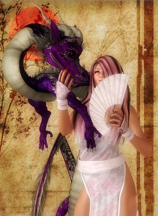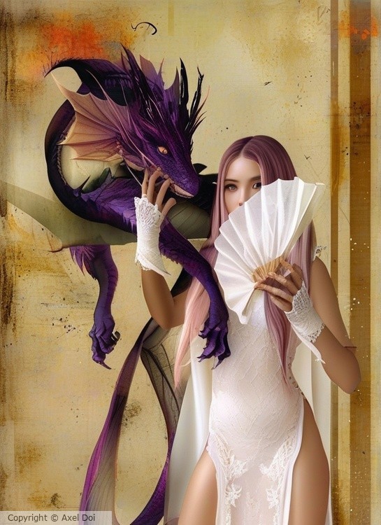 This digital artwork depicts a stylized, fantasy scene featuring a young woman and a dragon. The woman, standing in the foreground, has long, straight pink and dark brown hair and is dressed in a white, lace-trimmed, sleeveless qipao with high slits on the sides, revealing her pale skin. She holds a white, fan-like object with intricate patterns in her right hand, partially obscuring her face, which has a delicate, serene expression. Her left hand is adorned with a white lace glove, matching the lace details of her outfit. The dragon, positioned to her left and slightly behind, has vivid purple scales with black and grey accents. It has large, curved horns, a long snout, and expressive, glowing eyes. The dragon's claws are extended, gently touching the woman's hand with the fan. The background is a textured, aged parchment with brown and beige tones, featuring subtle, abstract patterns and vertical lines, adding a sense of depth and antiquity to the scene. The overall style of the artwork is a blend of fantasy realism, with detailed textures and a slightly ethereal, otherworldly atmosphere. The composition and colors create a harmonious balance between the mystical elements and the delicate beauty of the woman.