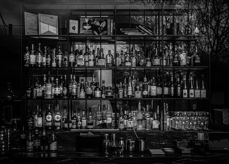 A selection of fine beverages behind the bar of the local pub on King St E in the Corktown neighbourhood of Toronto Canada. Original photography using a Canon EOS RP body with a Sigma 24-105mm F4 DG OS HSM Art Lens and Silver EFEX Pro as a Lightroom plugin for the Black and White conversion. Brian Carson The Learning Curve Photography https://linktr.ee/thelearningcurvephotography