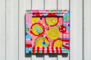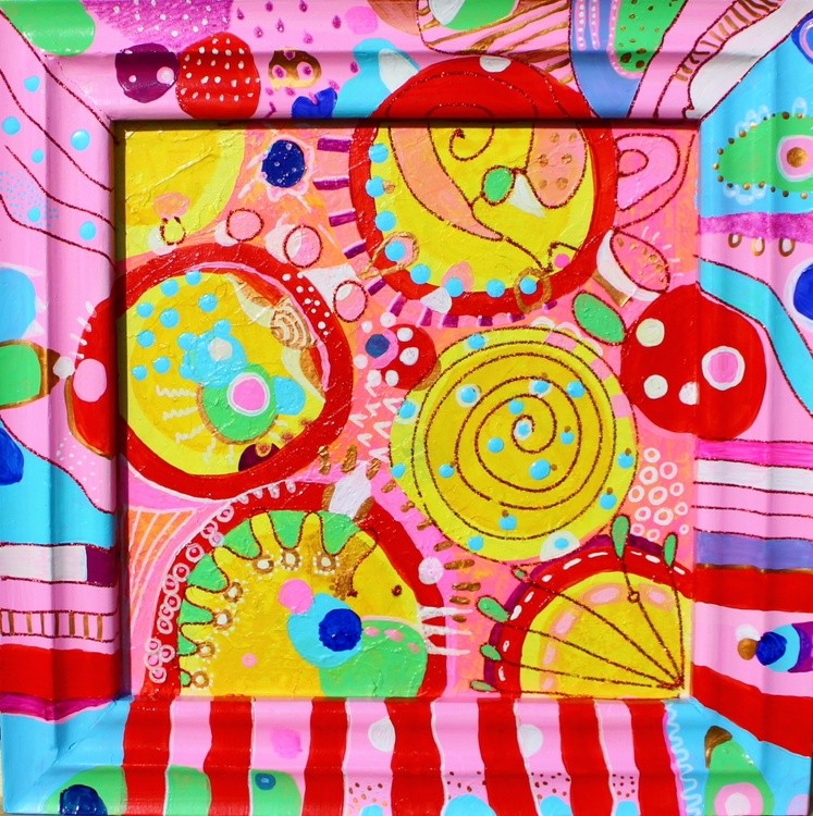 Bright yellows, warm reds, playful pinks, turquoise blues, and soft greens form layered circular motifs, spirals, dots, and stripes. The framed composition enhances the sense of intimacy and structure, inviting the viewer to step into a cheerful, imaginative space filled with balance and harmony. Each detail contributes to a feeling of lightness, optimism, and creative freedom.