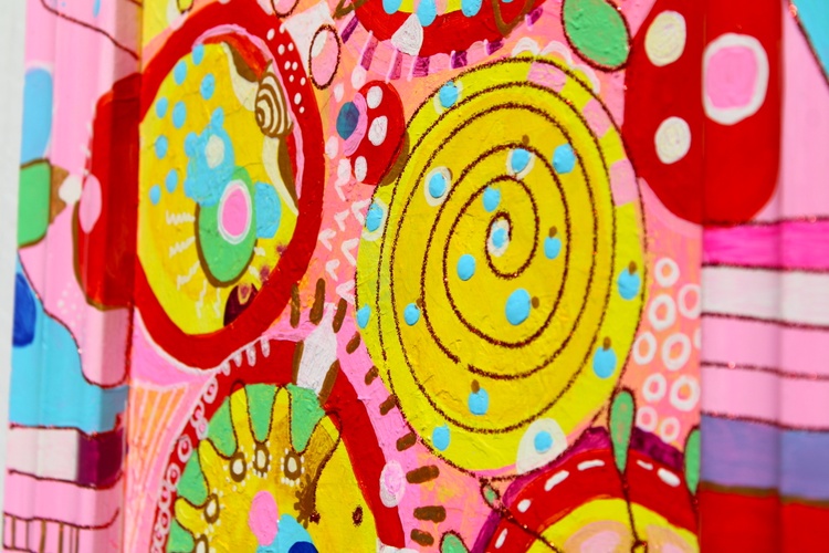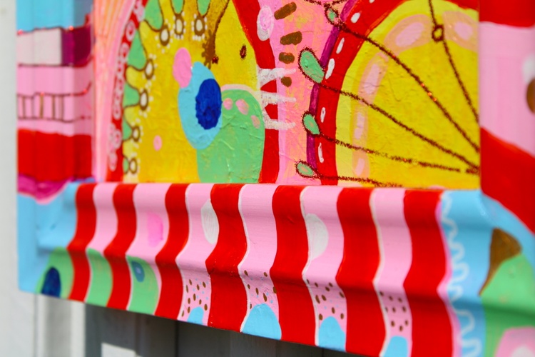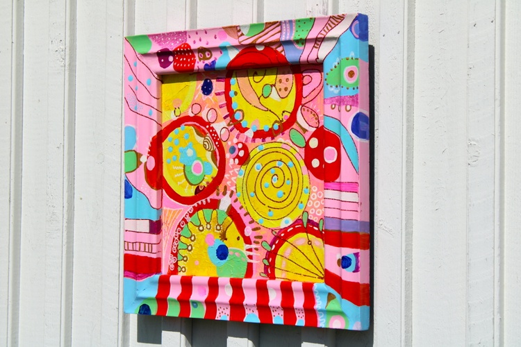Bright yellows, warm reds, playful pinks, turquoise blues, and soft greens form layered circular motifs, spirals, dots, and stripes. The framed composition enhances the sense of intimacy and structure, inviting the viewer to step into a cheerful, imaginative space filled with balance and harmony. Each detail contributes to a feeling of lightness, optimism, and creative freedom.