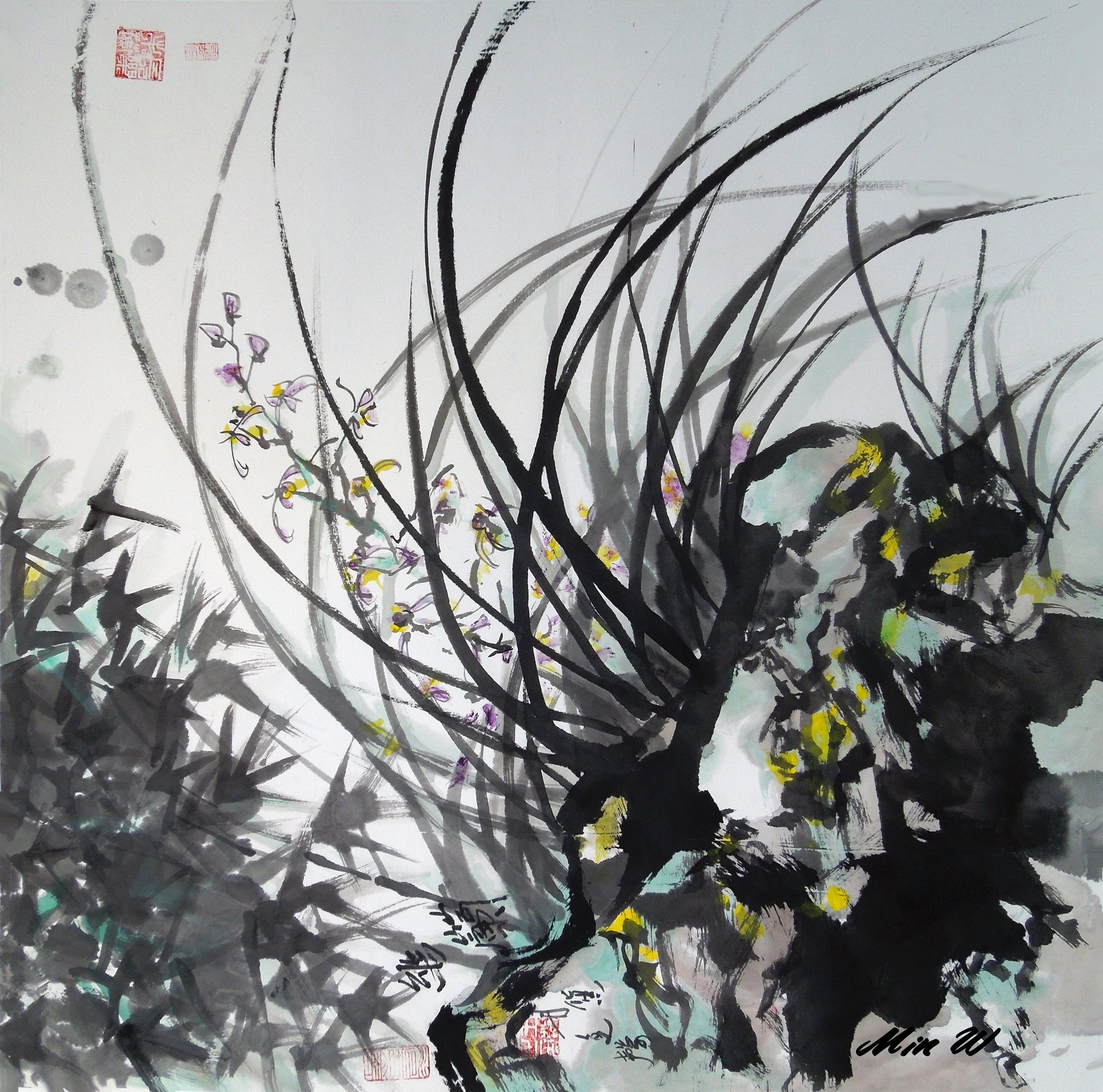 Painted in 2013, this signed original Chinese Brush (Watercolor) impression is 26" z 26" . It is painted on double-layer rice paper with 2.5" silk border incorporated surrounding the painting. The original painting, if purchased, comes with a signed “statement of authenticity” with an Artist's BIO information. This statement can be used by the buyer for insurance, estate planning, personal asset or resale of this painting if so desired. All copyrights of original and/or for reproductions are reserved by LRB Fine Art. Reproductions on canvas can be purchased at: https://fineartamerica.com/profiles/min-w or www.artpal.com/Ontap456