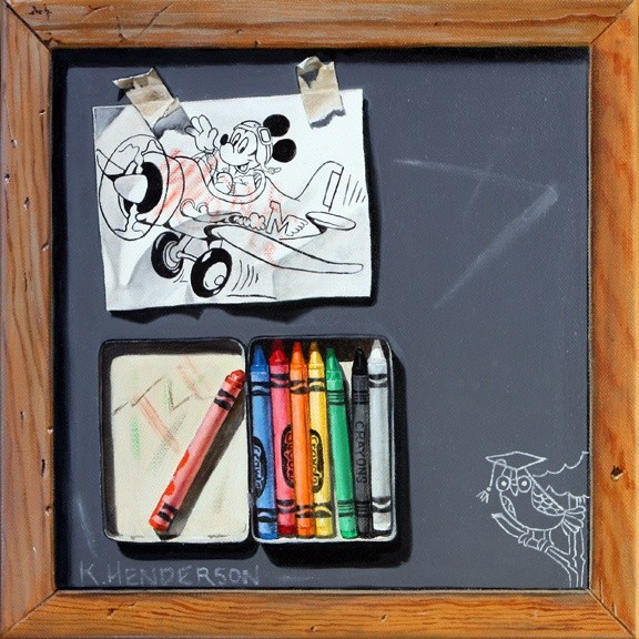 Flight of Fancy, 12 x 12, oil on canvas This Trompe L'Oeil features a page from a coloring book showing Mickey Mouse in his airplane. The page is artfully colored with the crayons shown in the tin box. The owl on the vintage chalk board completes the Flight theme. The original Oil painting has sold but prints are available in My Etsy Shop https://www.etsy.com/shop/KHendersonFineArt