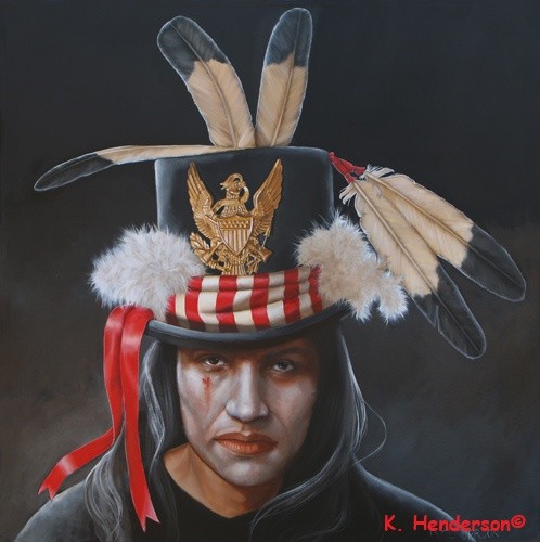 The Delegate, 36 x 36, oil on canvas This painting is a continuation of my 'Top Hat" series. In the 1880's The Powers That Be in the United States Government would invite American Indian leaders to Washington. There they were given gifts such as clothing, flags, hats etc. The recipient would then use these items as they saw fit. This hat is decorated with parts of a flag, an emblem from a helmet, ribbons and feathers Available