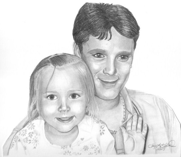 8x10 pencil sketch of father and daughter (daughter is in Germany); in the zoomed image you will see the matted picture in center with 2 black & white photos on the side they are 4x4 ea. Finished out total size was 16x20