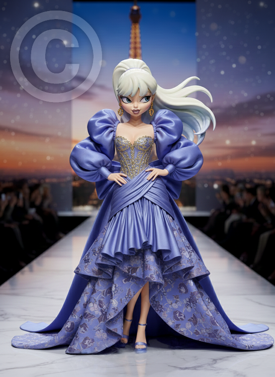 Miss Periwinkle is showcasing her style on the runway in Paris! AI assisted with my character art.