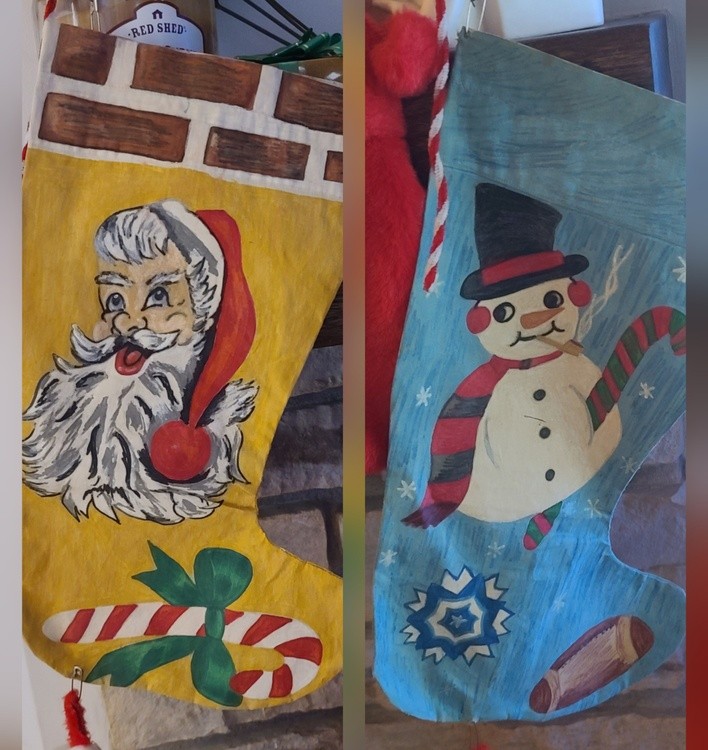 WHEN MY BOY WERE SMALL,WE DIDN'T HAVE EXTRA MONEY. SO I MADE THEIR CHRISTMAS SOCKS OUT OF AN OLD SHEET. I DIDN'T HAVE ANY KIND OF PAINTS BUT THESE COLOR PENS OF SOME SORT. THE TIPS WERE SMALL LIKE AN INK PEN AND SOME HOW I MANAGED TO PAINT THEIR WHOLE SOCKS. FRONT AND BACK. SURPRISED THEM THIS YEAR AND GAVE THEM THEIR CHILDHOOD CHRISTMAS SOCKS. !! I STILL WONDER HOW ON EARTH DID I DO THESE.