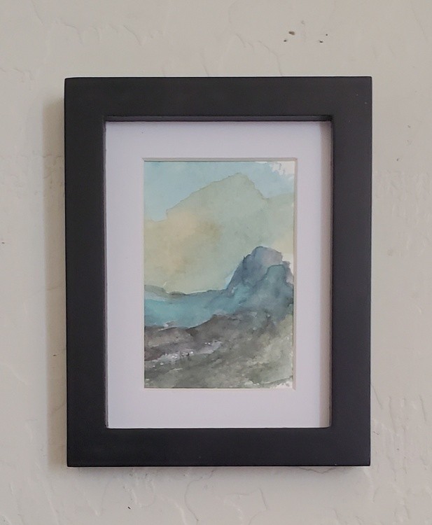 Granite Ridge is a small watercolor, 2 by 3 inches matted to 3 by 4, capturing a quiet moment in our local terrain. The piece centers on a rugged rock formation, its cool blue and gray tones layered to reveal texture and form. Behind it, gentle washes of muted green and yellow outline distant hills, while a soft blue sky stretches calmly overhead. Working with watercolor allowed the colors to flow and blend naturally, creating a stillness that invites you to pause and consider the quiet strength of the landscape. This piece reflects a familiarity with place, rendered simply but with careful attention to the interplay of light and surface.