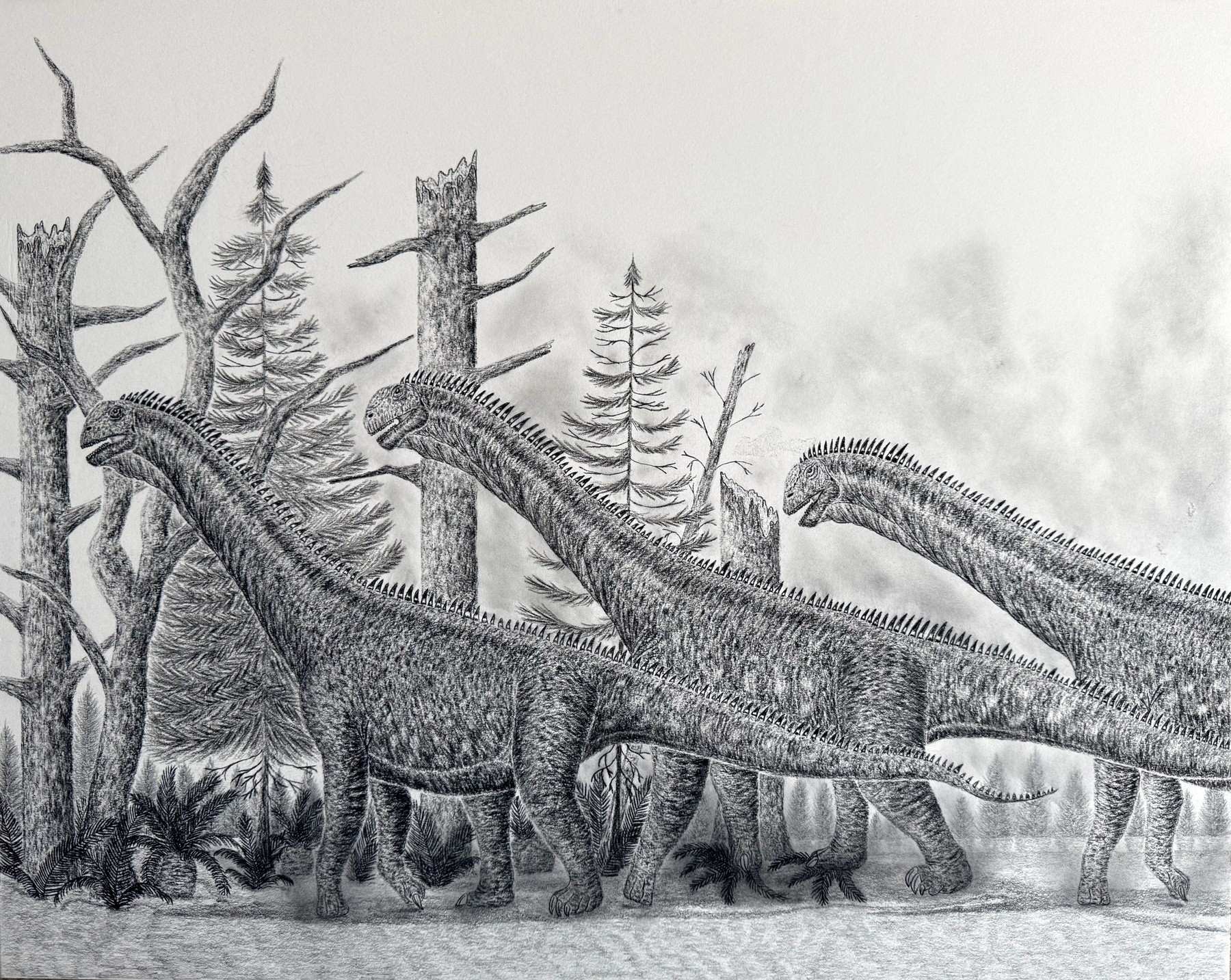 A small herd of Camarasaurus lentus on the move in a Late Jurassic environment. This artwork was completed in January 2026 using a combination of charcoal and graphite pencils on a 16"x20" cold press illustration board. The dinosaurs were completed in charcoal ranging from HB to 6B while elements of the background were completed in graphite ranging from 6H to 6B.