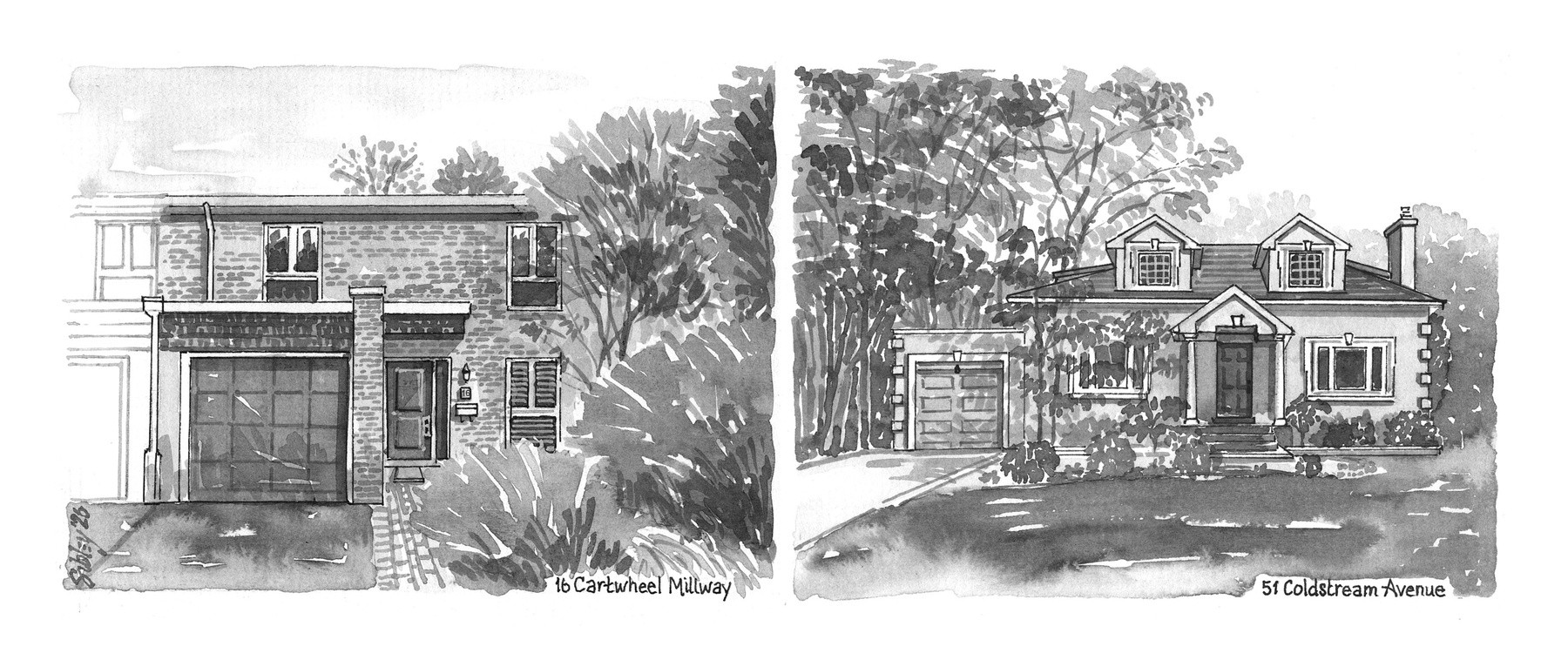 I call this one a Duo Sibley Home Portrait. The framed original was sold to the real estate agent who gave it to the owners of both properties as a record of their purchases. In this case they were moving to a condo so two separate paintings would be too much.
