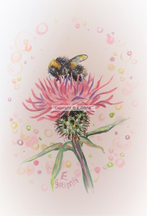 A small watercolour painting of a sweet little bee going about it's business with a bit of a magical background which feels like summer, pollen, floating seeds, sparkles and sunshine. I do love the little busy bees
