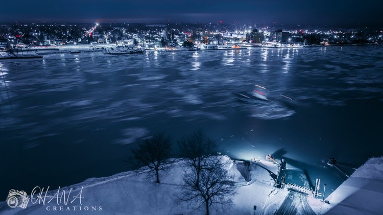 Long exposure of the St Clair V river crossing. Detroit River, Amherstburg, Ontario, Canada