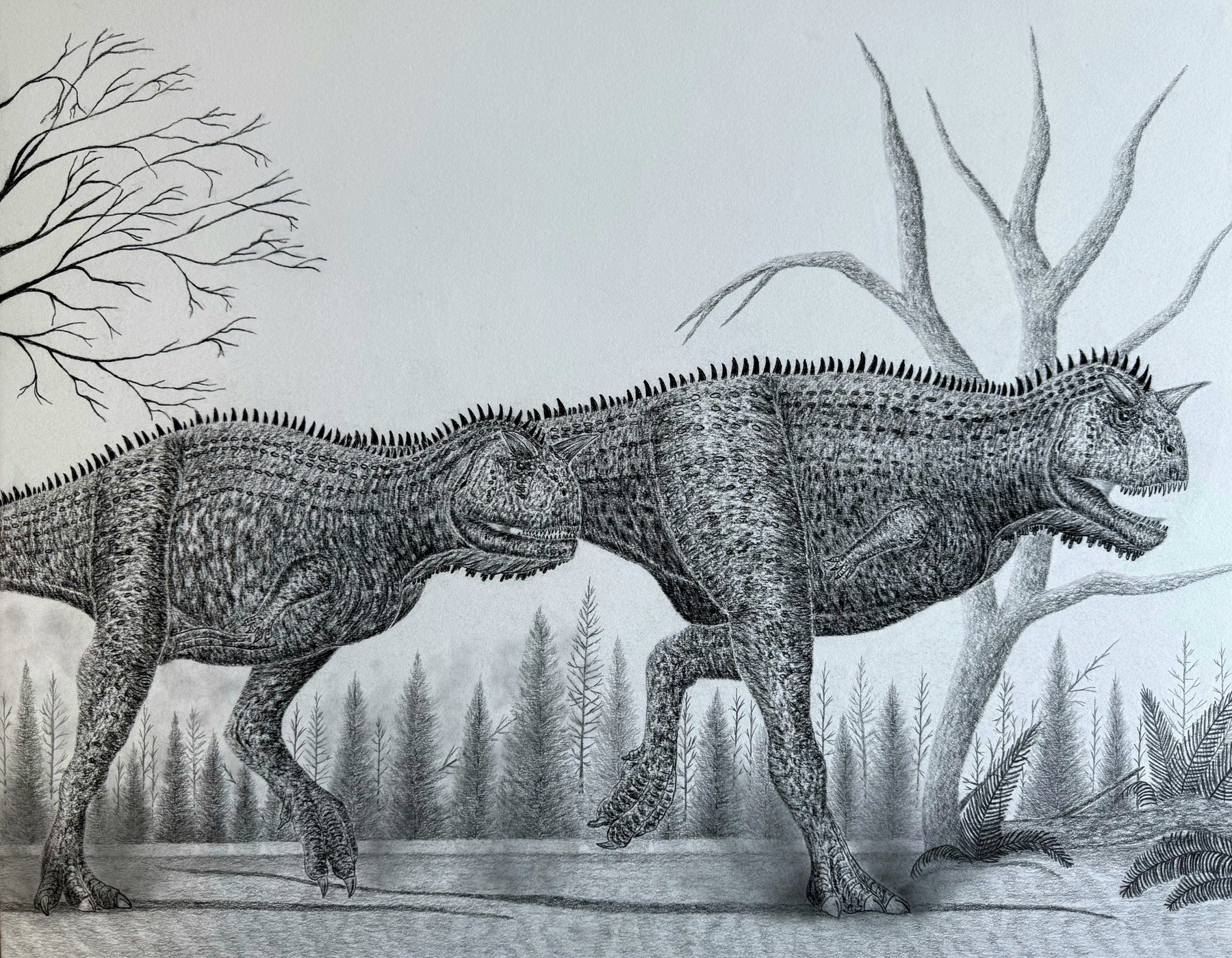 A male & female Carnotaurus sastrei pair on a Late Cretaceous run. This artwork was completed in February 2026 using a combination of charcoal and graphite pencils on a 16"x20" cold press illustration board. The dinosaurs were completed in charcoal ranging from HB to 6B while the background elements were completed in graphite from 6H to 6B. The dust was completed with charcoal powder and several paint brushes.