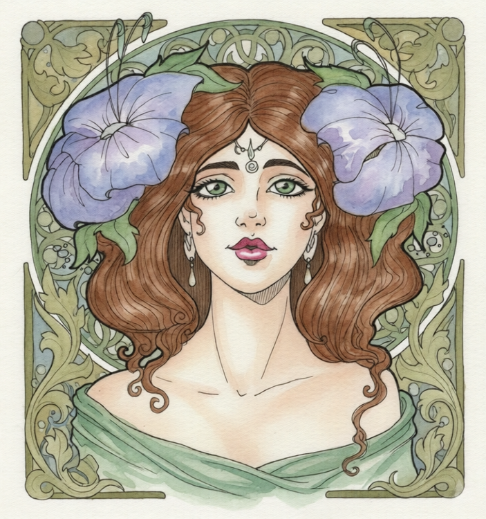 Lavender Moonflower Maiden is an original artwork created in ink and watercolor, detailed with the assistance of AI.