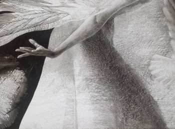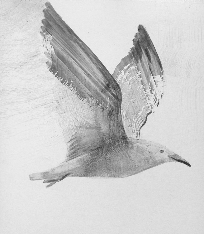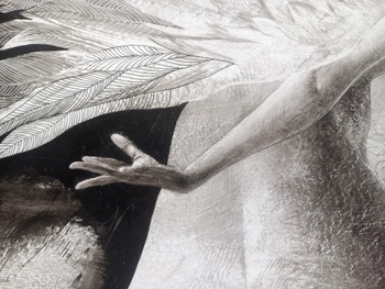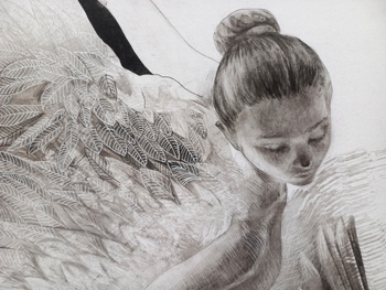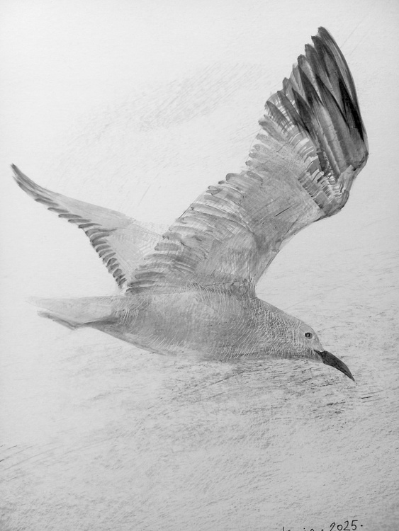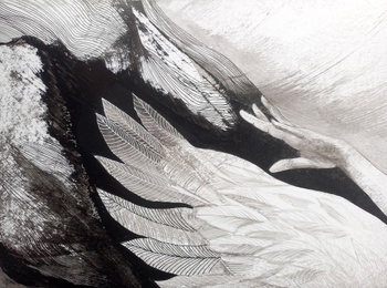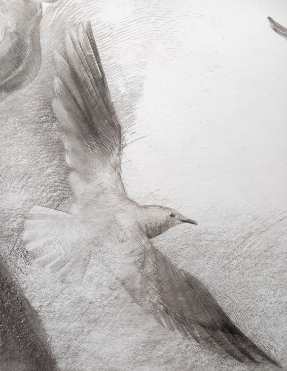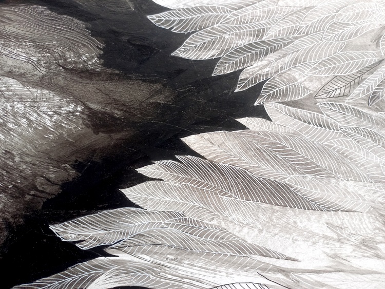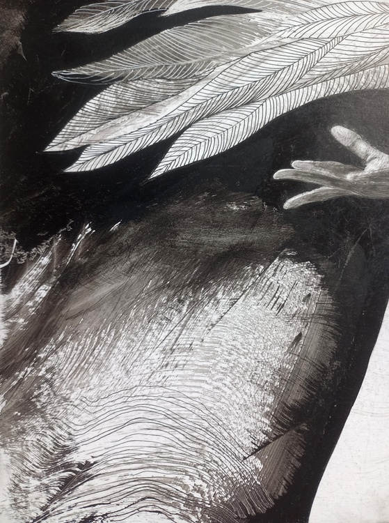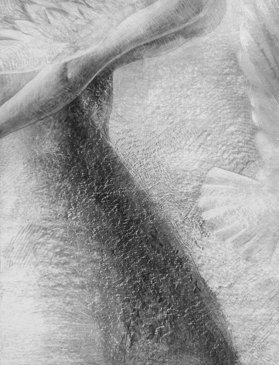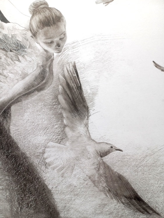 The graphic work depicts a moment following inner transformation, when new wings have already become part of the body but have not yet turned into a natural extension of movement. This state requires time, focus, and daily practice. The birds surrounding the heroine do not function as symbols of freedom; instead, they establish a rhythm and measure through which the human body learns a new physical and psychological balance. The process resembles a ballet lesson at the barre — concentrated, repetitive, and without spectacle. The work explores the phase of adapting to change, when freedom has not yet arrived, but former constraints have already lost their power. It is a fragile in-between space that demands patience and inner discipline.