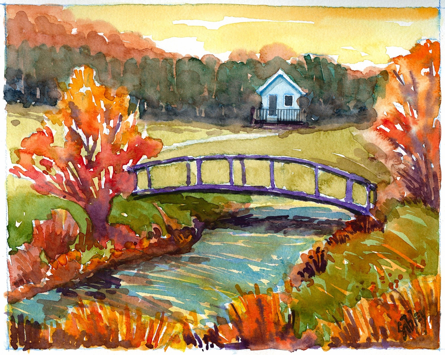 A romantic depiction of a pastoral scene with a cottage, a little foot bridge over a slow moving creek.