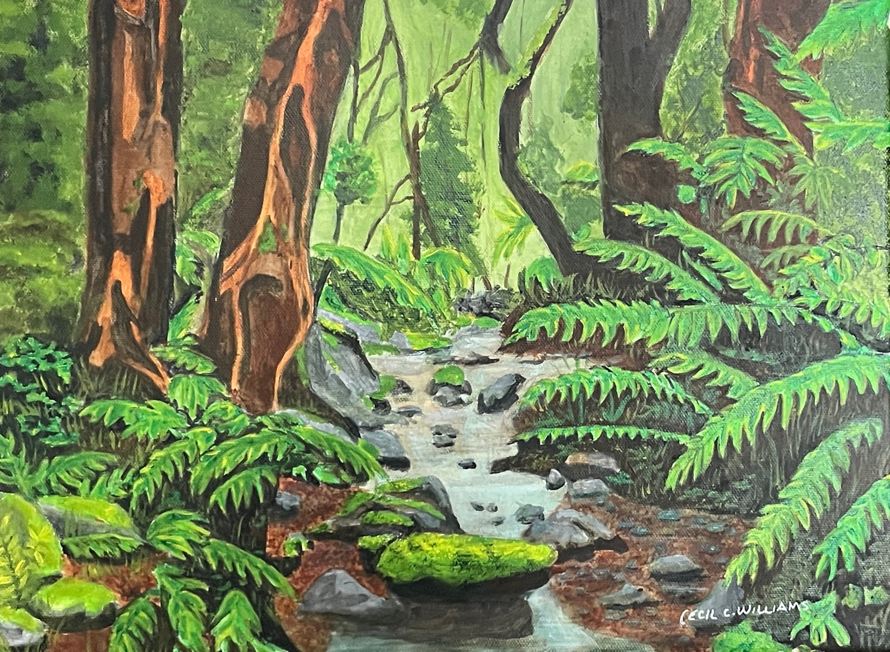 standing in a tropical forest looking at a slow moving stream.