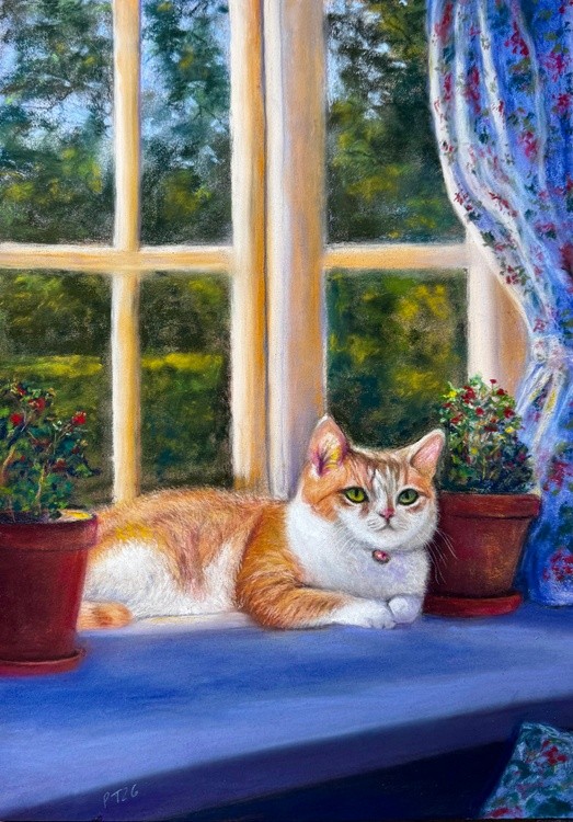 A cat sitting by a window view of the gardens