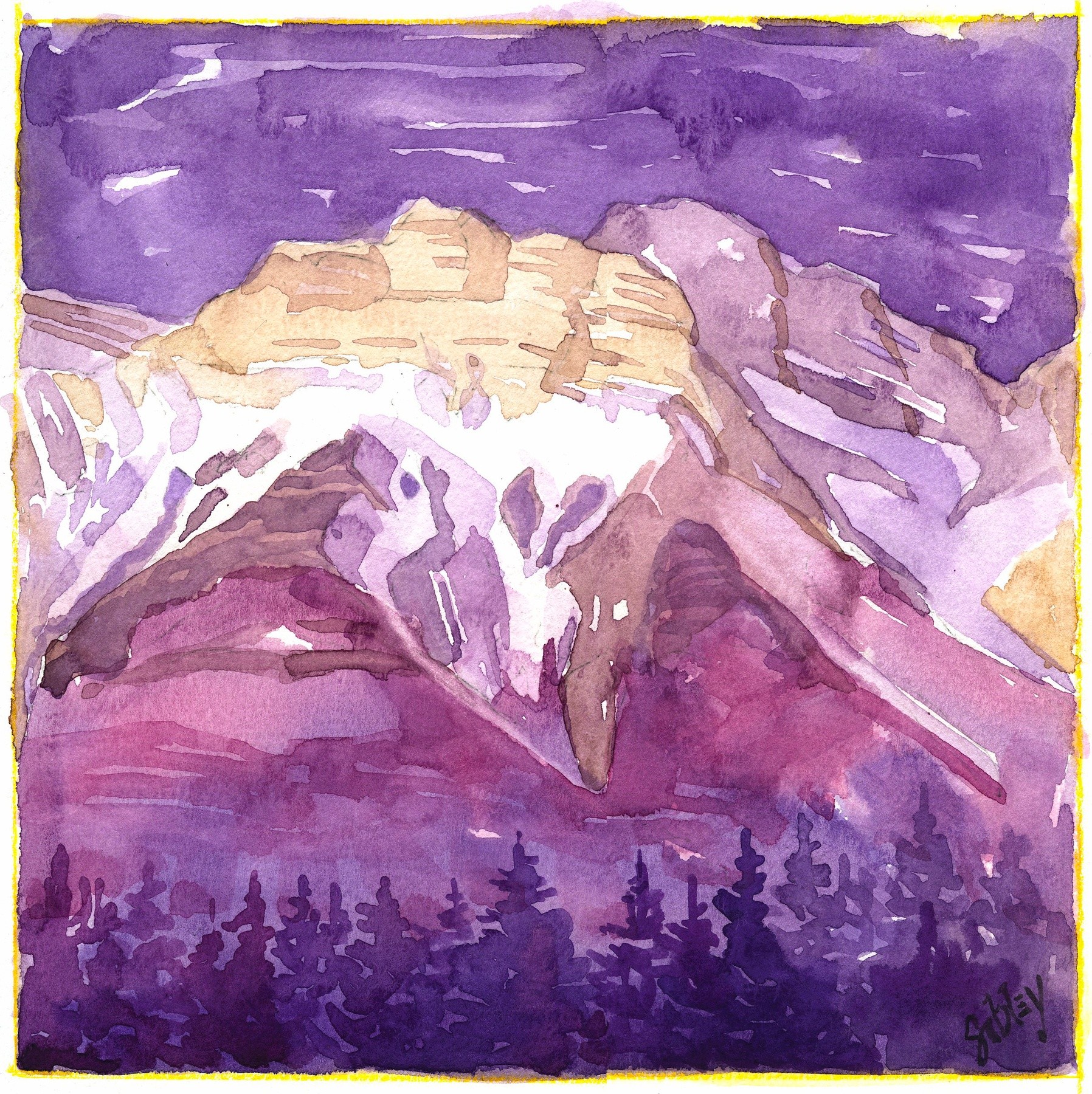 Canmore is a town in Alberta’s Rocky Mountains, west of Calgary. It’s known for craggy summits like the Three Sisters and Ha Ling Peak. This painting is one of the three sisters.