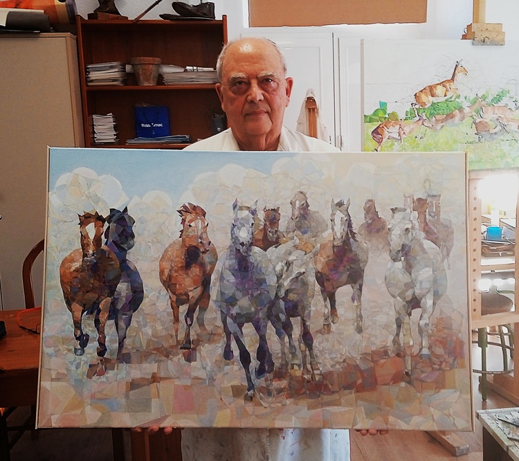 Representa a un grupo de caballos salvajes galopando por una tierra polvorienta.