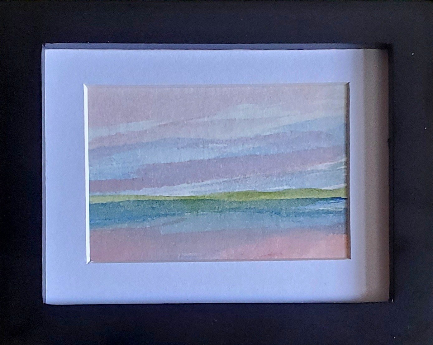 I’m sharing a new watercolor titled Awakening. This small piece measures 2 by 3 inches, matted to 3 by 4 inches, and explores a calm, abstract landscape through horizontal bands of pastel tones. Soft pinks, purples, blues, and greens blend quietly across the surface, moving from light sky-like hues at the top to deeper horizon colors in the center, with delicate pinks below that suggest a reflective ground or water. The work reflects a moment of stillness and subtle natural movement—an invitation to pause and take in the gentle rhythms of dawn.